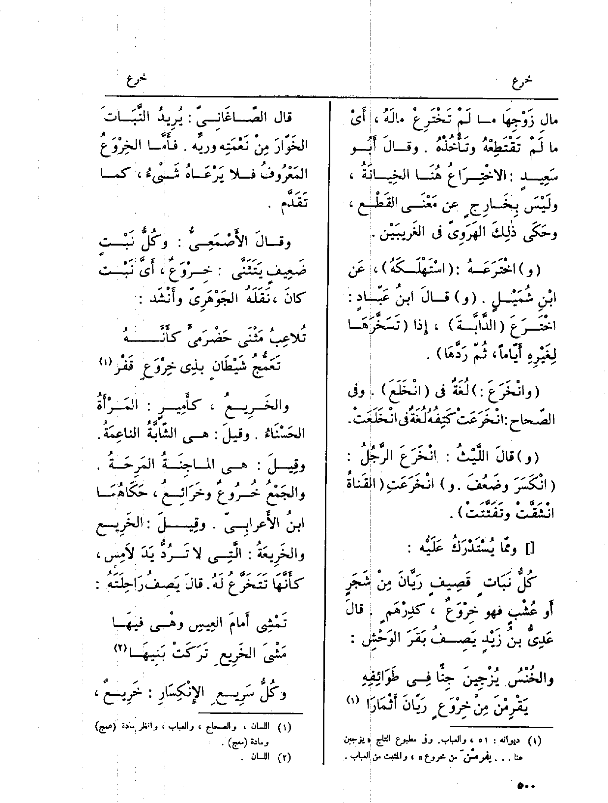 قَالَ الصّاغَانِيّ: يُرِيدُ النَّبَاتَ الخَوّارَ مِنْ نَعْمَتِه وريَّه. فأَمَّا الخِرْوَعُ المَعْرُوفُ فَلَا يَرْعَاهُ شَيْءُ، كَمَا تَقَدَّم. وقالَ الأَصْمَعِيُّ: وكُلُّ نَبْتٍ ضَعِيفٍ يَتَثَنَّى: خِرْوَعٌ، أَيَّ نَبْت كانَ، نَقَلَهُ الجَوْهَرِيّ وأَنْشَد: