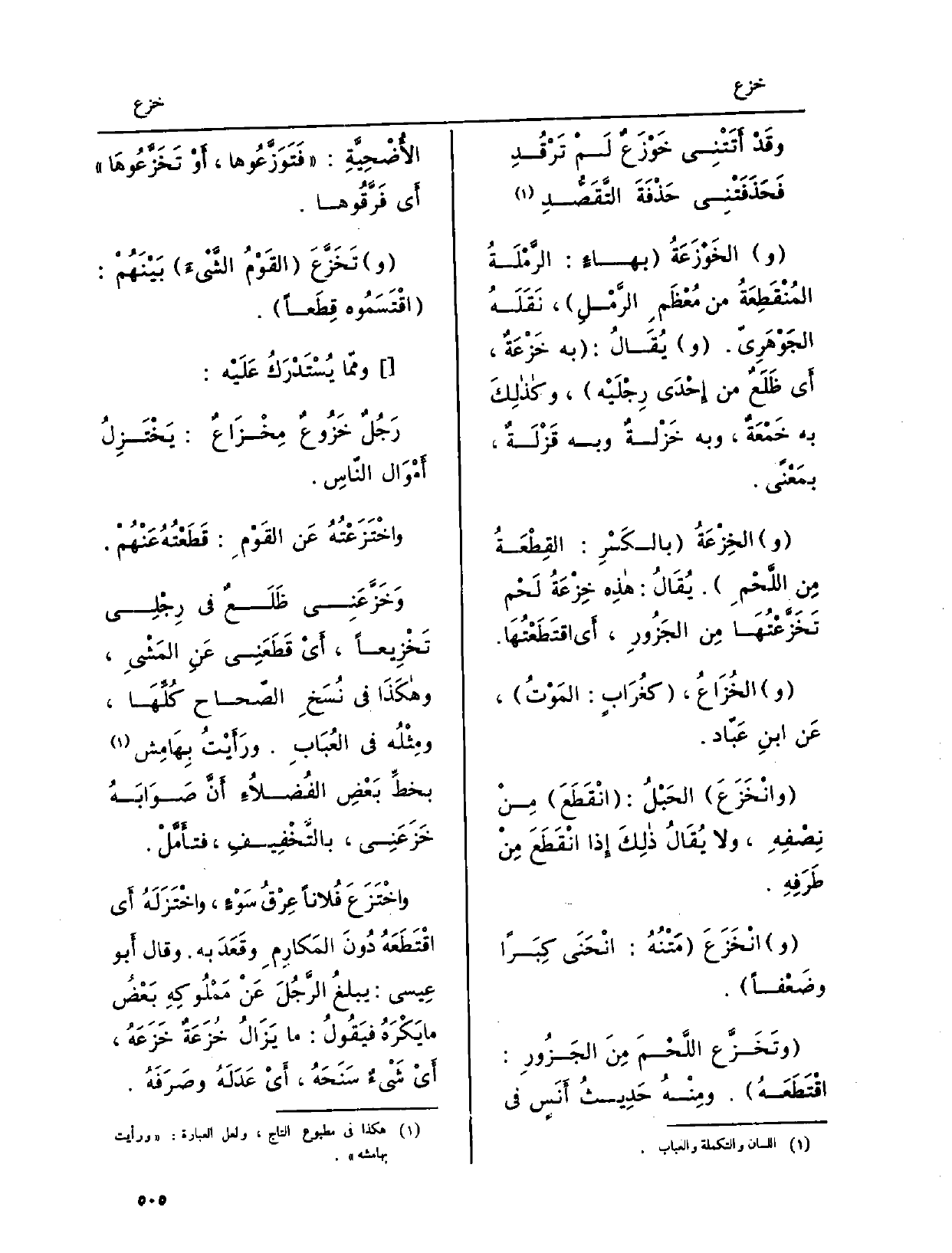 وممّا يُسْتَدْرَكُ عَلَيْه: رجُلٌ خَزُوعٌ مِخْزَاعٌ: يَخْتَزِلُ أَمْوَال النّاسِ. واخَتَزَعْتُهُ عَن القوْمِ: قَطَعْتُهُ عَنْهُمُ. وَخَزَّعنِي ظَلَعٌ فِي رِجْلِي تَخْزِيعاً، أَي قَطَعَنِي عَنِ المَشْيِ، وهكَذَا فِي نُسَخَ الصّحاح كُلِّهَا، ومِثْلُه فِي العُبَابِ. ورَأَيْتُ بِهَامِش بخَطِّ بَعْضِ الفُضلاُءِ أَنَّ صَوَابَهُ خَزَعَنِي، بالتَّخْفِيفِ، فتأَمَّلْ.
