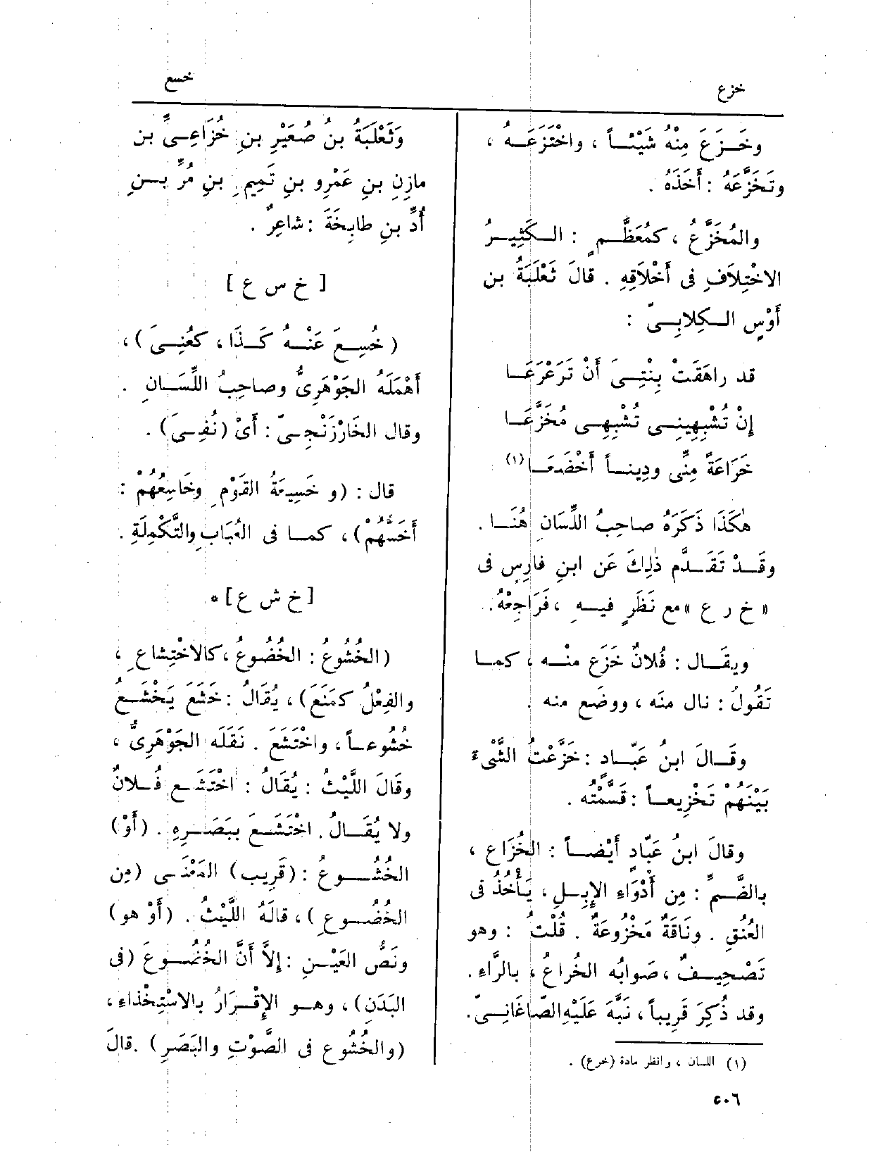 وخَزَعَ مِنْهُ شَيْئاً، واخْتَزَعَهُ، وتَخَزَّعَهُ: أَخَذَهُ. والمُخَزَّعُ، كمُعَظَّمٍ: الكَثِيرُ الاخْتِلاَفِ فِي أَخْلاَقِهِ. قالَ ثَعْلَبَةُ بن أَوْسٍ الكِلابِيّ: قد راهَقَتْ بِنْتِيَ أَنْ تَرَعْرَعَا إِنْ تُشْبِهِينِي تُشْبِهِي مُخَزَّعَاً خَرَاعَةً مِنِّي ودِيناً أَخْضَعَاً وهكَذَا ذَكَرَهُ صاحِبُ اللِّسَانِ هُنَا. وقَدْ تَقَدَّم ذلِكَ عَن ابنِ فارِسٍ فِي خَ ر ع، مَعَ نَظَرٍ فيهِ، فَرَاجِعْهُ. ويقَال: فُلانٌ خَزَع منْه، كَمَا تَقُولُ: نَالَ منَه، ووضَع مِنْهُ. وقَالَ ابنُ عَبّادٍ: خَزَّعْتُ الشَّيْءَ بَيْنَهُمْ تَخْزِيعاً: قَسَّمْتُه. وقالَ ابنُ عَبّادٍ أَيْضاً: الخُزَاع، بالضَّمِّ: مِن أَدْوَاءِ الإِبِلِ، يَأْخُذُ فِي العُنُقِ. ونَاقَةٌ مَخْزُوعَةٌ. قُلْتُ: وَهُوَ تَصْحِيفٌ، صَوابُه الخُراعُ، بالرَّاءِ. وَقد ذُكِرَ قَريباً، نَبَّهَ عَلَيْهِ الصّاغَانِيّ. وَثَعْلَبَةُ بنُ صُعَيْرِ بنِ خَزَاعِيِّ بن مازِنِ بنِ عَمْرِو بنِ تَمِيمِ بنِ مُرِّ بنِ أُدِّ بنِ طابِخَةَ: شاعِرٌ.)