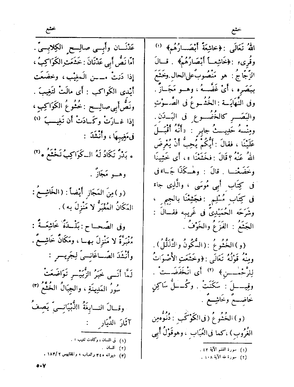 والخُشُوعُ فِي الكَوْكَبِ: دُنُوُّهِ مِن الغُرُوبِ، كَمَا فِي العُبَابِ، وَهُوَ قَوْلُ أَبِي عَدْنَان وأَبِي صالِحٍ الكِلابيّ. أَمّا نَصُّ أَبِي عَدْنَانَ: خَشَعَتِ الكَوَاكَبُ، إِذا دَنتْ من المَغِيْب، وخضَعَت أَيْدِي الكَواكب: أَي مالَتْ لتَغِيبَ. ونَصُّ أَبِي صالِحٍ: خُشُوعُ الكَوَاكِبِ، إِذا غارَتْ وكَادَتْ أَن تَغِيبَ فِي مَغِيبِهَا، وأَنْشَدَ: بَدْرٌ تَكَادُ لَهُ الكَوَاكِبُ تَخْشَعُ وَهُوَ مَجَازٌ. ومِنَ المَجَازِ أَيْضاً: الخَاشِعُ: المَكَانُ المُغْبَرُّ لَا مَنْزِلَ بِهِ. وَفِي الصّحاح: بَلْدَةٌ خَاشِعَةٌ: مُغْبَرَّةٌ لَا مَنْزِلَ بهَا، ومَكَانٌ خَاشِعٌ. وأَنْشَدَ الصّاغَانِيّ لِجَرِيرٍ: