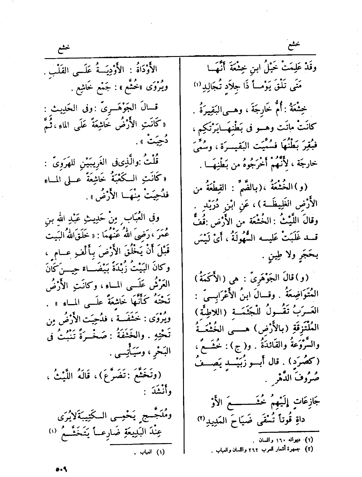 قالَ الجْوَهَرِيّ: وَفِي الحَدِيثِ: كَانِتِ الأَرْضُ خَاشِعَةً عَلَى الماءِ، ثُمَّ دُحِيَتْ. قُلْتُ: والَّذِي فِي الغَرِيبَيْنِ للهَرْوِيّ: كَانَتِ الكَعْبَةُ خَاشِعَةً على الماءِ فدُحِيَتْ مِنْهَا الأَرْضُ. وَفِي العُبَابِ مِنْ حَدِيثِ عَبْدِ اللهِ بنِ عُمَرَ، رَضِيَ اللهُ عَنْهُمَا: خَلَقَ اللهُ البَيت قَبْلَ أَنْ يَخْلُقَ الأَرْضَ بأَلْفِ عامٍ، وكانَ البَيْتُ زُبْدَةً بَيْضَاءً حِينَ كَانَ العَرْشُ عَلَى الماءِ، وكانَتِ الأَرْضُ تَحْتَهُ كَأَنَّهَا خَاشِعَةُ علَى الماءِ.)