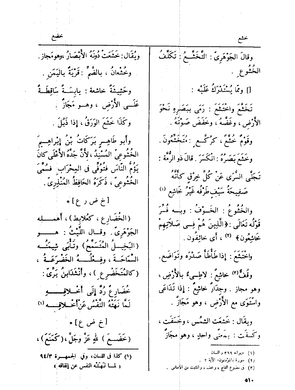 والخُشُوعُ: الخَوْفُ: وَبِه فُسِّرَ قَوْلُه تَعَالَى: الَّذِين هُمْ فِي صَلاَتِهِمْ خَاشِعُون، أَي خائِفُون.