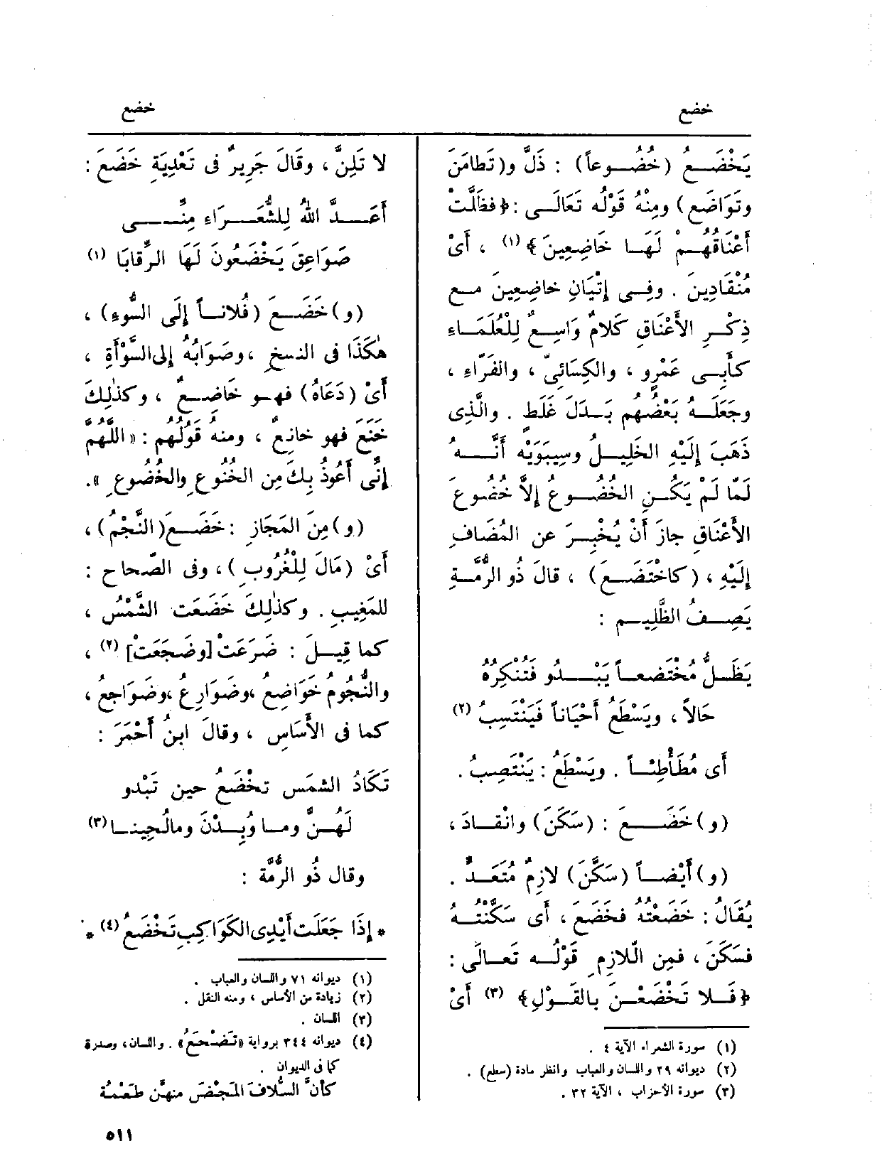 يَخْضَعُ خُضُوعاً: ذَلَّ وتَطامَنَ وتَوَاضَع ومِنْهُ قَوْلُه تَعَالَى: فظَلَّتْ أَعْنَاقُهُمْ لَهَا خَاضِعِينَ، أَيْ مُنْقَادِينَ. وفِي إِتْيَانِ خاضِعينَ مَعَ ذِكْرِ الأَعْنَاقِ كَلامٌ وَاسِعٌ لِلْعُلَمَاءِ كأَبِي عَمْروٍ، والكِسَائِيّ، والفَرّاءِ، وجَعَلَهُ بَعْضُهُم بَدَلَ غَلَطٍ. والَّذِي ذَهَبَ إِلَيْهِ الخَلِيلُ وسِيبَوَيْه أَنَّهُ لَمّا لَمْ يَكُنِ الخُضُوعُ إِلاَّ خُضُوعَ الأَعْنَاقِ جازَ أَنْ يُخْبِرَ عَن المُضَافِ إِلَيْهِ، كاخْتَضَعَ، قالَ ذُو الرُّمَّةِ يَصِفُ الظَّلِيم: