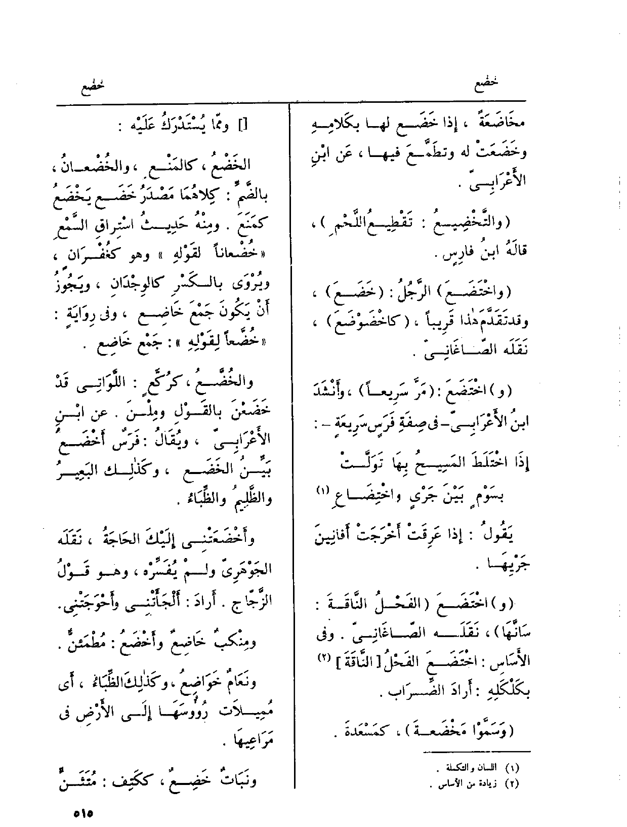 وممّا يُسْتَدْرِكُ عَلَيْه: الخَضْعُ، كالمَنْعِ، والخُضْعانُ، بالضَّمِّك كِلاهُمَا مَصْدَرُ خَضَع يَخْضَعُ كمَنَعَ. ومِنْهُ حَدِيثُ اسْتِراقِ السَّمْعِ خُضْعاناً لقَوْلهِ وَهُوَ كُغْفْرَانٍ، ويُرْوَى بالكَسْرِ كالوِجْدَانِ، ويَجُوزُ أَنْ يَكُونَ جَمْعَ خَاضِع، وَفِي رِوَايَةٍ: خُضَّعاً لِقَوْلِهِ: جَمْع خاضِع. والخُضَّعُ: كرُكَّعٍ: اللَّوَاتِي قَدْ خَضَعْنَ بالقَوْلِ ومِلْنَ. عَن ابْنِ الأَعْرَابِيّ، ويُقَالُ: فُرَسٌ أَخْضَعُ بَيِّنُ الخَضَع، وكَذلِكَ البَعيرُ والظَّلِيمُ والظِّبَاءُ. وأَخْضَعَتْنِي إِلَيْكَ الحَاجَةُ، نُقَلَه الجَوْهَرِيّ ولمْ يُفَسِّرْه، وَهُوَ قَوْلُ الزَّجّاج. أَرادَ: أَلْجَأَتْنِي وأَحْوَجَتِنِي. ومِنْكبٌ خَاضِعٌ وأَخْضَعَ: مُطْمَئنٌّ. ونَعَامٌ خَوَاضِعُ، وكذلِكَ الظِّبَاءُ، أَي مُمِيلاَت رُؤُوسَهَا إِلَى الأَرْضِ فِي مَرَاعِيهَا. ونَبَاتٌ خَضِعٌ، ككَتِفِ: مُتَثَنٍّ