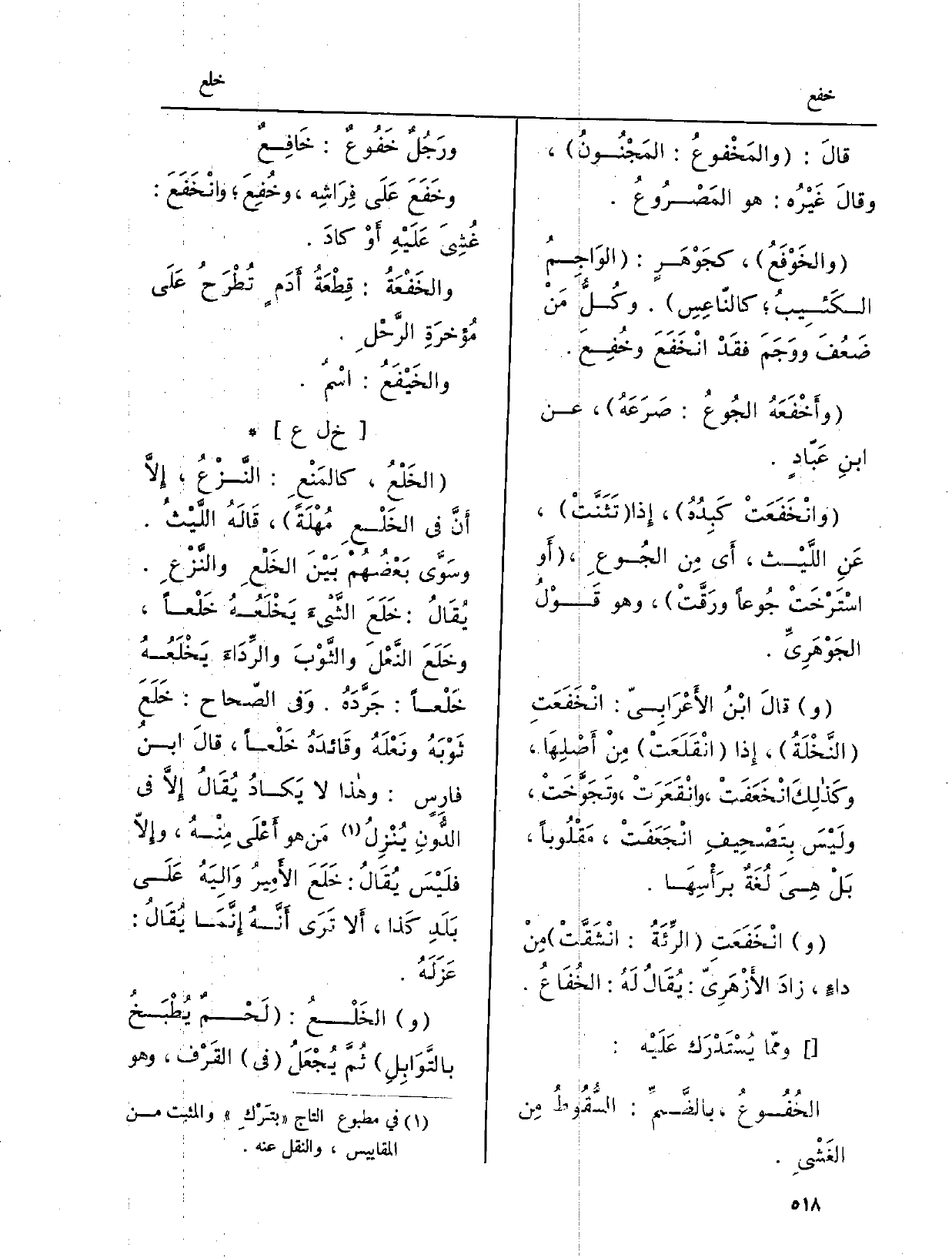 انْقَلَعَتْ مِنْ أَصْلِهَا، وكَذلِكَ انْخَعَفَتْ، وانْقَعَرَتْ، وتَجَوَّخَتْ، ولَيْسَ بِتَصْحِيفِ انْجَعَفَتْ، مَقْلُوباً، بَلْ هِيَ لُغَةٌ برَأْسِهَا. وانْخَفَعَتِ الرِّئَةُ: انْشَقَّتْ مِنْ داءٍ، زادَ الأَزْهَرِيّ: يُقَالُ لَهُ: الخُفَاعُ. وممّا يُسْتَدْرَك عَلَيْه: الخُفُوعُ، بالضَّمِّ: السُّقُوطُ مِن الغَشْيِ. ورَجُلٌ خَفُوعٌ: خَافِعٌ. وخَفَعَ عَلَى فِرَاشِه، وخُفِعَ، وانْخَفَعَ: غُشِيَ عَلَيْهِ أَوْ كادِ. والخَفْعَةُ: قِطْعَةُ أَدَمٍ تُطْرَحُ عَلَى مُؤخرَةِ الرَّحْلِ. والخَيْفَعُ: اسْمٌ.