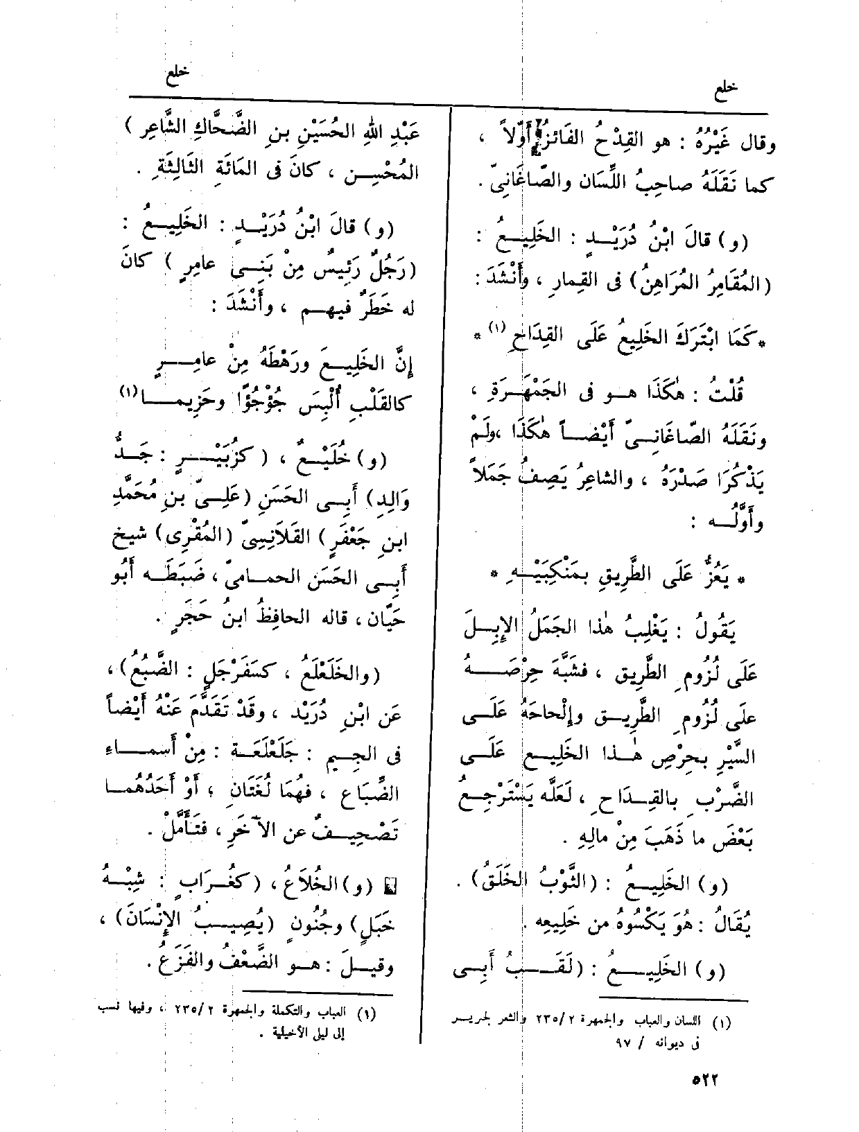 والصّاغَانِيّ. وقالَ ابْنُ دُرَيْدٍ: الخَلِيعُ: المُقَامِرُ المُرَاهِنُ فِي القِمارِ، وأَنْشَدَ: كَمَا ابْتَرَكَ الخَلِيعُ عَلَى القِدَاحِ قُلْتُ: هكَذَا هُوَ فِي الجَمْهَرَةِ، ونَقَلَهُ الصّاغَانِيّ أَيْضاً هكَذَا، ولَمْ يَذْكُرَا صَدْرَهُ، والشاعِرُ يَصِفُ جَمَلاً وأَوَّلُه. يَعُزُّ عَلَى الطَّرِيقِ بمَنْكِبَيْهِ يَقُولُ: يَغْلِبُ هَذَا الجَمَلُ الإِبِلَ عَلَى لُزُومِ الطَّرِيق، فشَبَّهَ حِرْصَهُ علَى لُزُومِ الطَّرِيق وإِلْحاحَهُ عَلَى السَّيْرِ بحِرْص هَذَا الخَلِيع عَلَى الضَّرْبِ بالقِدَاحِ، لَعَلَّه يَسْتَرْجِعُ بَعْضَ مَا ذَهَبَ مِنْ مالِهِ.