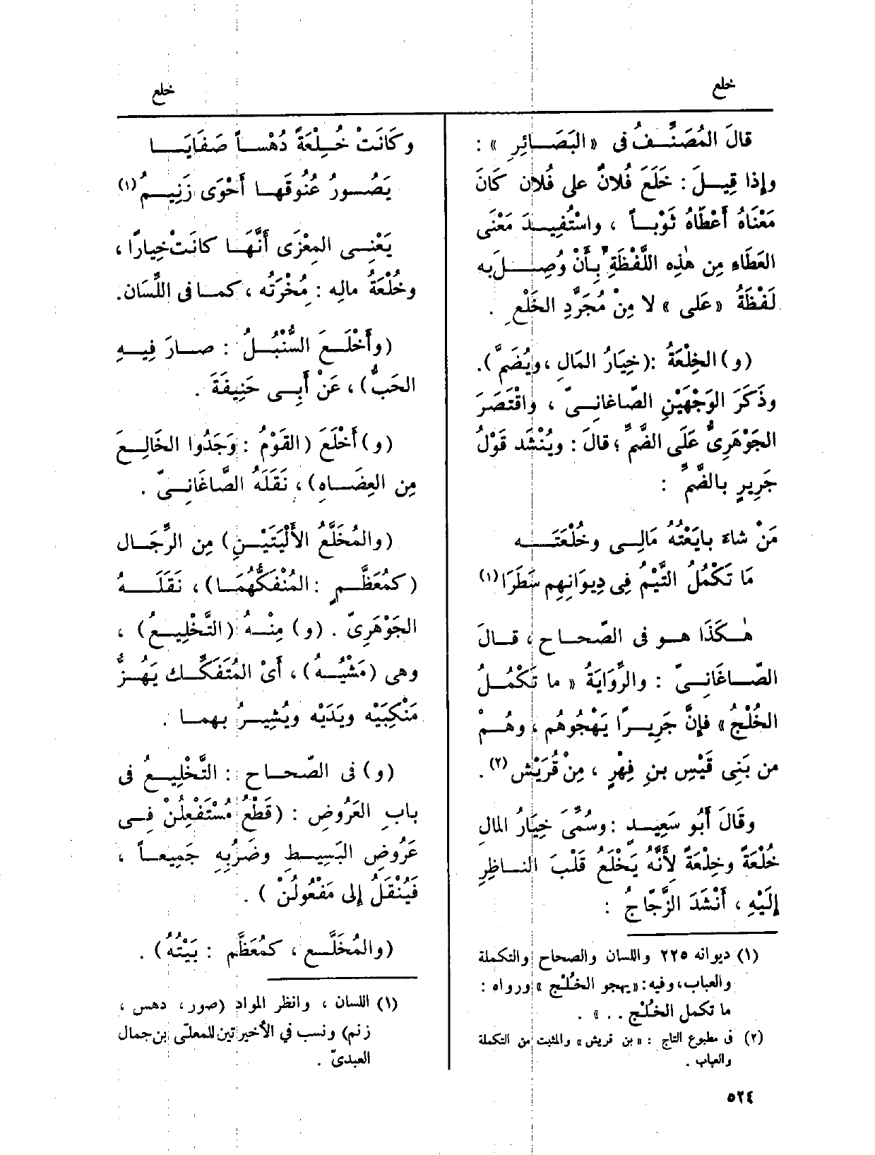 هكَذَا هُوَ فِي الصّحاح، قالَ الصّاغَانِيّ: والرِّوَايَةُ مَا تَكْمُلُ الخُلْجُ فإِنَّ جَرِيراً يُهْجُوهُم، وهُمْ من بَنِي قَيْسِ بنِ فِهْرٍ، مِنْ قُرَيْش. وقالَ أَبُو سَعِيدٍ: وسُمِّيَ خِيَارُ المالِ خُلْعَةً وخِلْعَةً لأَنَّهُ يَخْلَعُ قَلْبَ الناظِرِ إِلَيْهِ، وأَنْشَدَ الزَّجّاجُ:
