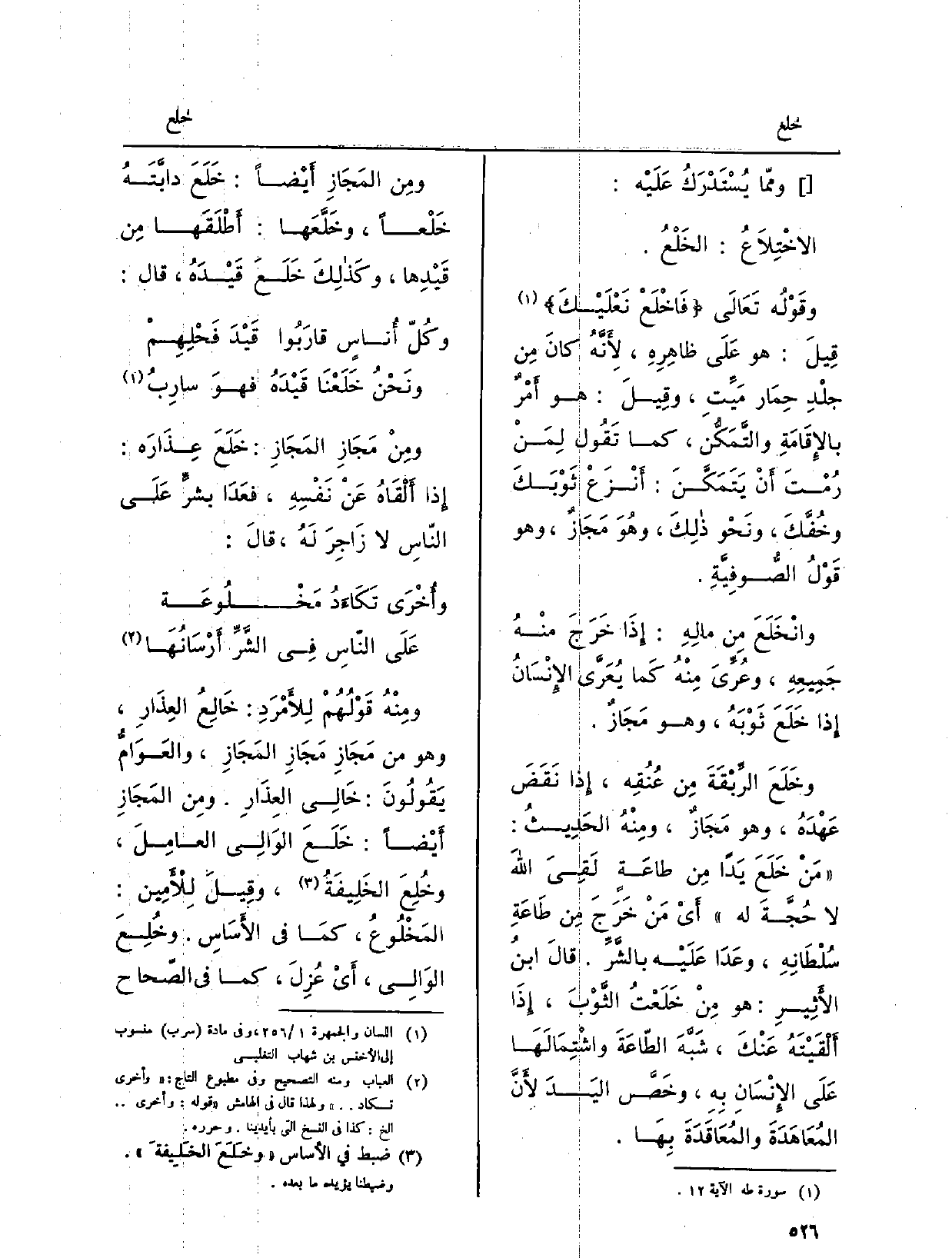 وممّا يُسْتَدْرَكُ عَلَيْه: الاخْتِلاَعُ: الخَلْعُ. وقَوْلُه تَعَالَى فَاخْلَعْ نعَلَيْكَ قِيلَ: هُوَ عَلَى ظاهِرِهِ، لأَنَّهُ كانَ مِن جلْدِ حِمَار مَيِّتِ، وقِيلَ: هُوَ أَمْرٌ بالإِقَامَةِ والتَّمَكُّن، كَمَا تَقُول لِمَنْ رُمْتَ أَنْ يَتَمَكَّنَ: أَنْزَعْ ثَوْبَكَ وخُفَّكَ، ونَحْو ذلِكَ، وهُوَ مَجَازٌ، وَهُوَ قُوْلُ الصُّوفِيَّةِ. وانْخَلَعَ مِن مالِهِ: إِذَا خَرَجَ منْهُ جَمِيعِهِ، وعُرِّيَ مِنْهُ كَما يُعَرَّى الإِنْسَانُ إِذا خَلَعَ ثَوْبَهُ، وَهُوَ مَجَازٌ. وخَلَعَ الرِّبْقَةَ مِن عُنُقِه، إِذا نَقَضَ عَهْدَهُ، وَهُوَ مَجَازٌ، ومِنْهُ الحَدِيثُ: مَنْ خَلَعَ يَداً مِن طاعَةٍ لَقِيَ اللهَ لَا حُجَّةَ لَهُ أَيْ مَنْ خَرَجَ مِن طَاعَةِ سُلْطَانِهِ، وعَدَا عَلَيْه بالشَّرِّ. قالَ ابنُ الأَثِيرِ: هُوَ مِنْ خَلَعْتُ الثَّوْبَ، إِذَا أَلْقَيْتَهُ عَنْكَ، شَبَّهَ الطّاعَةَ واشْتِمَالَهَا عَلَى الإِنْسَانِ بِهِ، وخَصَّ اليَدَ لأَنَّ المُعَاهَدَةُ والمُعَاقَدَةَ بِهَا. ومِن المَجَازِ أَيْضاً: خَلَعَ دابَّتَهُ خَلْعاً، وخَلَّعَها: أَطْلَقَها مِن قَيْدِها، وكذلِكَ خَلَعَ قَيْدَهُ، قَالَ: