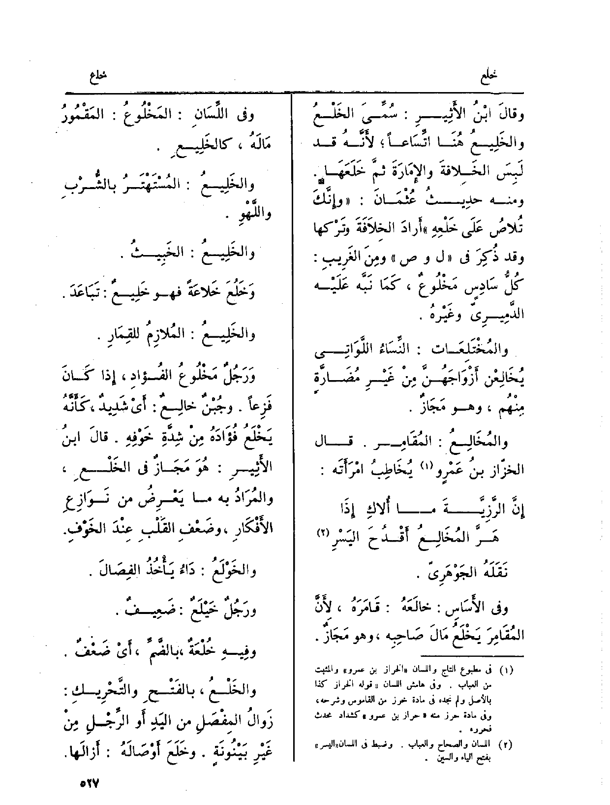وقالَ ابْنُ الأَثِيرِ: سُمِّيَ الخَلْعُ والخَلِيعُ هُنَا اتِّساعَاً، لأَنَّهُ قد لَبِسَ الخَلافةَ والإِمَارَةَ ثمَّ خَلَعَها. وَمِنْه حدِيثُ عُثْمَانَ: وإِنَّكَ تُلاصُ عَلَى خَلْعِهِ أَرادَ الخِلاَفَةَ وتَرْكها وَقد ذُكِرَ فِي ل وص، ومِنَ الغَرِيبِ: كُلُّ سَادِسٍ مَخْلُوعٌ، كَمَا نَبَّه عَلَيْه الدَّمِيرِيّ وغَيْرهُ. والمُخْتَلِعَات: النِّسَاءُ اللَّوَاتِي يُخَالِعْن أَزْوَاجَهُنَّ مِنْ غَيْرِ مُضَارَّةٍ مِنْهُم، وَهُوَ) مَجَازٌ. والمُخَالِعُ: المُقَامِر. قَالَ الخزّار بنُ عَمْروٍ يُخَاطِبُ امْرَأَتَه:
