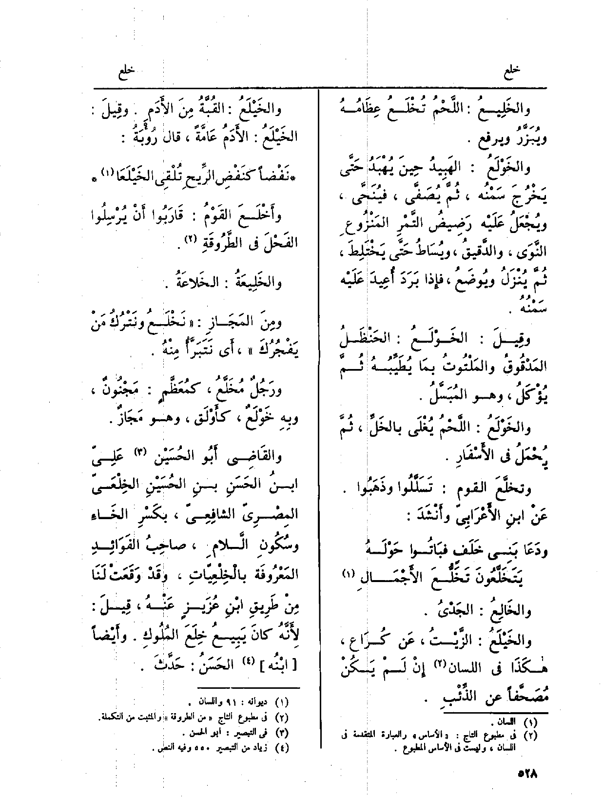 والخَيْلَعُ: القُبَّةُ مِنَ الأَدَمِ. وقِيلَ: الخَيْلَعُ: الأَدَمُ عَامَّةً، قَالَ رُؤْبَةُ: نَفْضاً كنَفْضِ الرِّيحِ تُلْقِي الخَيْلَعَا وأَخْلَعَ القَوْمُ: قَارَبُوا أَنْ يُرْسِلُوا الفَحْلَ فِي الطَّرُوقَةِ. والخَلِيعَةُ: الخَلاعَةُ. ومِنَ المَجَازِ: نَخْلَعُ ونَتْرُكُ مَنْ يَفْجُرُكَ، أَي نَتَبَرَّأُ مِنْهُ. ورَجُلٌ مُخَلَّعُ، كمُعَظَّمٍ: مَجْنُونٌ، وبِهِ خَوْلَعٌ، كأَوْلَق، وَهُوَ مَجَازٌ. والقَاضِي أَبُو الحُسَيْن عَلِيّ ابنُ الحَسَنِ بنِ الحُسَيْنِ الخِلْعَيّ المِصْرِيّ الشافِعِيّ، بكَسْرِ الخاءِ وسُكُونِ الَّلامِ، صاحِبُ الفَوَائِدِ المَعْرُوفَة بالْخِلْعِيّاتِ، وقَدْ وَقَعَتْ لَنَا مِنْ طَرِيقِ ابْنِ عَزَيزٍ عَنْهُ، قِيلَ: لأَنَّهُ كانَ يَبِيعُ خِلَعَ المُلُوكِ. وأَيْضاً ابْنُه الحَسَنُ: حَدَّثَ.