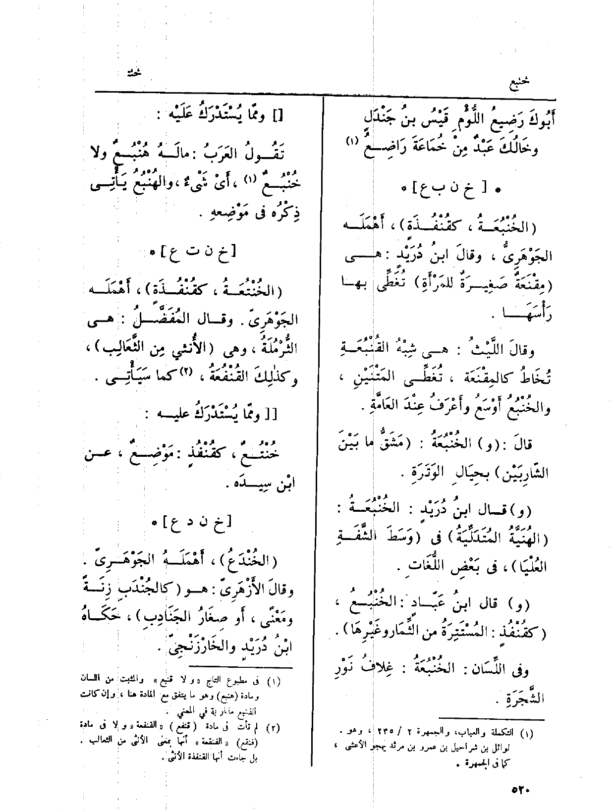 الخُنْتُعَةُ، كقُنْفُذَةٍ، أَهْمَلَه الجَوْهَرِيّ. وَقَالَ المُفَضَّلُ: هِيَ الثُّرْمُلَةُ، وَهِي الأُنثي مِن الثَّعَالِب، وكذلِكَ القُنْفُعَةُ، كَمَا سَيَأْتِي. وممّا يُسْتَدْرَكُ عَلَيْهِ: خُنْتُعٌ، كقُنْفُذٍ: مَوْضِعٌ، عَن ابْن سِيدَه.