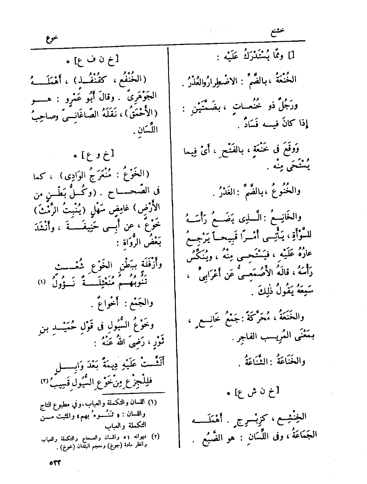 والجَمْع: {أَخْواعٌ.} وخَوْعُ السُّيُول فِي قَوْلِ حُمَيْدِ بنِ ثَوْرٍ، رَضِيَ اللهُ عَنْهُ: