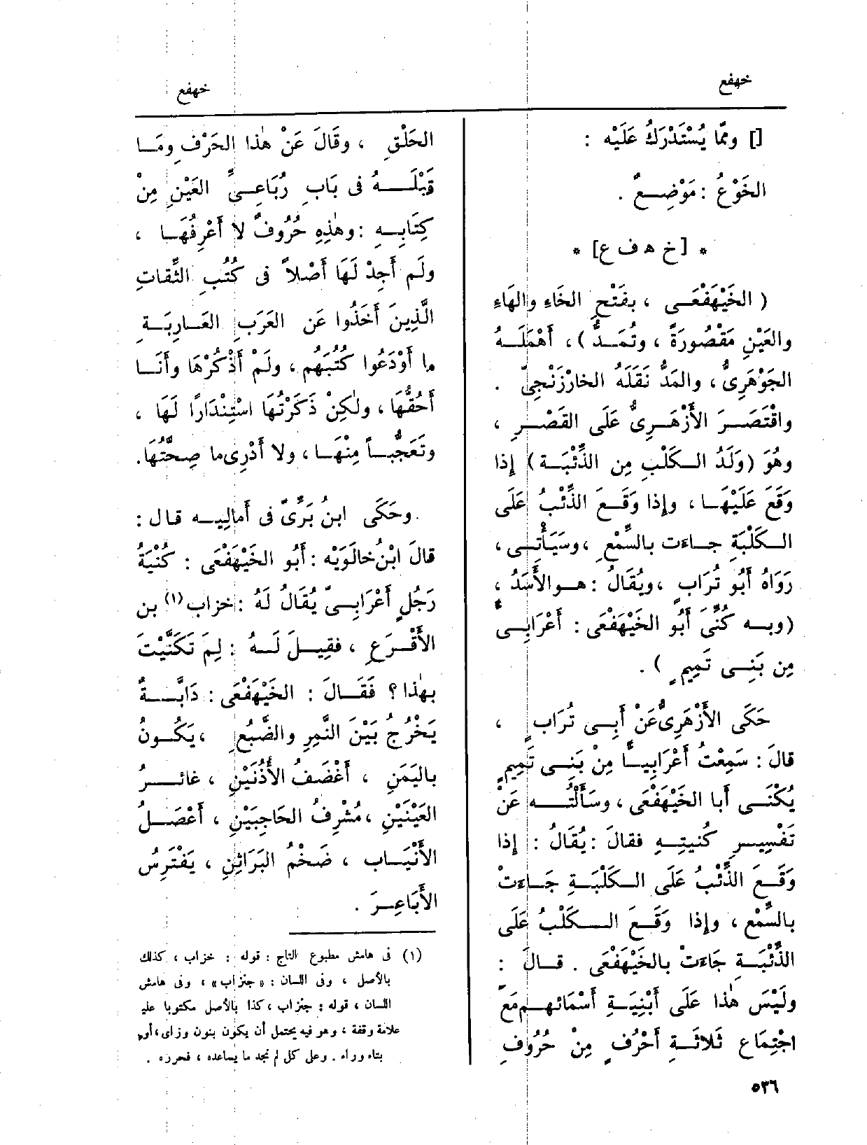 واقْتَصَرَ الأَزْهَرِيُّ عَلَى القَصْرِ، وهُوَ وَلَدُ الكَلْبِ مِن الذِّئْبَة إِذا وَقَعَ عَلَيْهَا، وإِذا وَقَعَ الذِّئْبُ عَلَى الكَلْبَةِ جاءَت بالسِّمْعِ، وسَيَأْتِي، رَوَاهُ أَبُو تُرَابٍ، يُقَالُ: هُوَ الأَسَدُ، وَبِه كُنِّىَ أَبُو الخَيْهَفَعَي: أَعْرَابِي مِن بَنِي تَمِيمٍ. حَكَى الأزْهَرِيُّ عَنْ أَبِي تُرَابٍ، قالَ: سَمِعْتُ أَعْرَابِياً مِنْ بَنِي تَمِيمٍ يُكْنَى أَبا الخَيْهَفْعَي، وسَأَلْتُه عَنْ تَفْسِيرِ كُنيتِهِ فقالَ: يُقَالُ: إِذا وَقَعَ الذِّئْبُ عَلَى الكَلْبَةِ جَاءَتْ بالسِّمْع، وإِذا وَقَعَ الكَلْبُ عَلَى الذِّئْبَةِ جَاءَتْ بالخَيْهَفْعَي. قالَ: ولَيْسَ هَذَا عَلَى أَبْنِيَةِ أَسْمَائهم مَعَ اجْتِمَاع ثَلاثَةِ أَحْرُفٍ مِنْ حُرُوفِ الحَلْقِ، وقَالَ عَنْ هَذَا الحَرْفِ ومَا قَبْلَهُ فِي بَابِ رُبَاعيِّ العَيْنِ مِنْ كِتَابِهِ: وهذِهِ حُرُوفٌ لَا أَعْرِفُهَا، ولَم أَجِدْ لَهَا أَصْلاً فِي كُتُبِ الثِّقاتِ الَّذِينَ أَخَذُوا عَن العَرَبِ العَارِبَةِ مَا أَوْدَعُوا كُتُبَهُم، ولَمْ أَذْكُرْهَا وأَنَا أَحُقُّهَا، ولكِنْ ذَكَرْتُهَا اسْتِنْدَاراً لَهَا، وتَعَجُّباً مِنْهَا، وَلَا أَدْرِي مَا صِحَّتُهَا. وحَكَى ابنُ بَرِّيّ فِي أمالِيه قَالَ: قالَ ابْنُ خَالَوَيْه: أَبُو الخَيْهَفْعَي: كُنْيَةُ رَجُلٍ أَعْرَابِيّ يُقَالُ لَهُ: خزاب بن الأَقْرَعِ، فقِيلَ لَهُ: لِمَ تَكَنَّيْتَ بِهَذَا فَقَالَ: الخَيْهَفْعَي: دَابَّةٌ يَخْرُجُ بَيْنَ النَّمِرِ والضَّبُعِ، يَكُونُ باليَمَنِ، أَغْضَفُ الأُذُنَيْنِ، غائرُ العَيْنَيْنِ، مُشْرِفُ الحَاجَبَيْنِ، أَعْصَلُ الأَنْيَاب، ضَخْمُ البَرَاثِنِ، يَفْتَرِسُ الأَبَاعِرَ.)