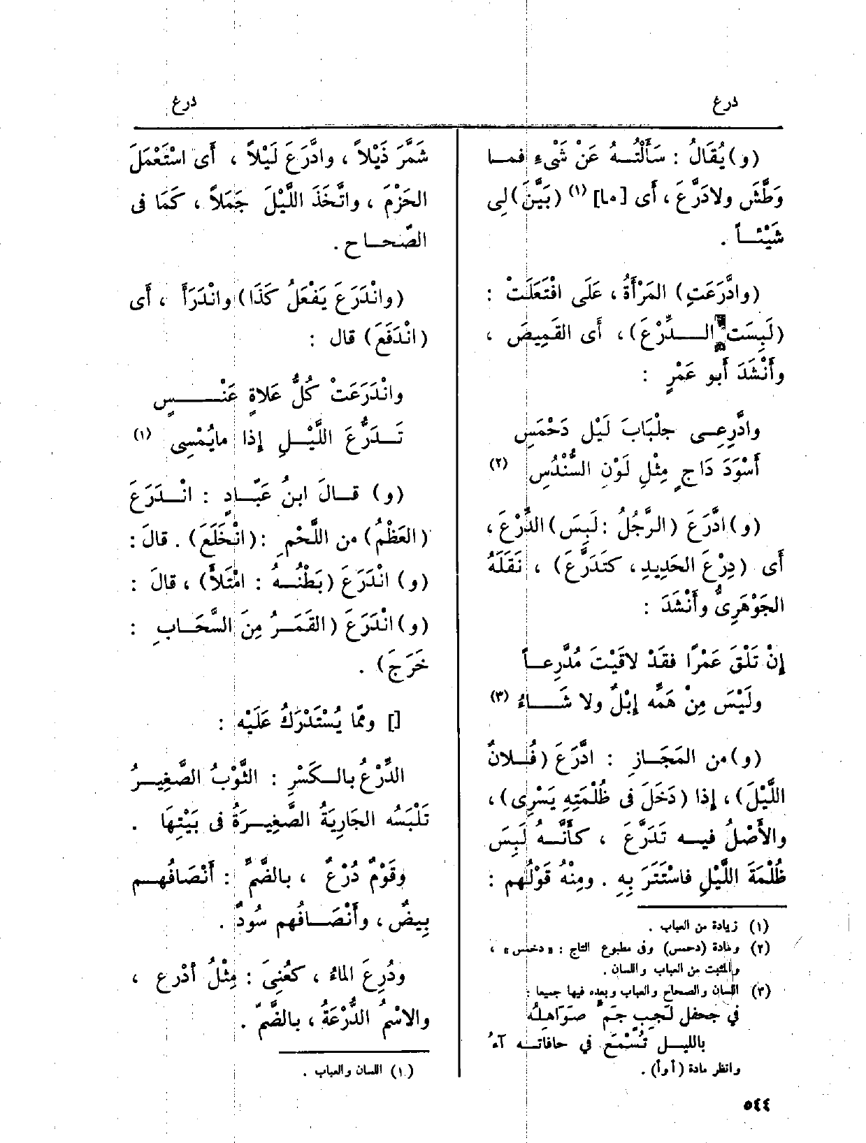اللَّيْلِ فاسْتَتَرَ بِهِ. ومِنْهُ قَوْلُهم: شَمَّرَ ذَيْلاً، وادَّرَعَ لَيْلاً، أَي اسْتَعْمَلَ الحَزْمَ، واتَّخَذَ اللَّيْلَ جَمَلاً، كَمَا فِي الصّحاح. وانْدَرَعَ يَفْعَلُ كَذَا وانْدَرَأَ، أَي انْدَفَعَ قَالَ: وانْدَرَعَتْ كُلُّ عَلاةٍ عَنْسٍ تَدَرُّعَ اللَّيْلِ إِذا مَا يُمْسِي وقالَ ابنُ عَبّادٍ: انْدَرَعَ العَظْمُ من اللَّحْمِ: انْخَلَعَ. قالَ: وانْدَرَعَ بَطْنُهُ: امْتَلأَ، قالَ: وانْدَرَعَ القَمَرُ مِنَ السَّحَابِ: خَرَجَ. وممّا يُسْتَدْرَكُ عَلَيْه: الدِّرْعُ بالكَسْرِ: الثَّوْبُ الصَّغِيرُ تَلْبِسُه الجَارِيَةُ الصَّغِيرَةُ فِي بَيْتِهَا. وقَوْمٌ دُرْعٌ، بالضَّمِّ: أَنْصَافُهم بِيضٌ، وأَنْصَافُهم سُودٌ. ودُرِعَ الماءُ، كعَنِىَ: مِثْلُ أَدْرع، والاسْمُ الدُّرْعَةُ، بالضَّمّ.