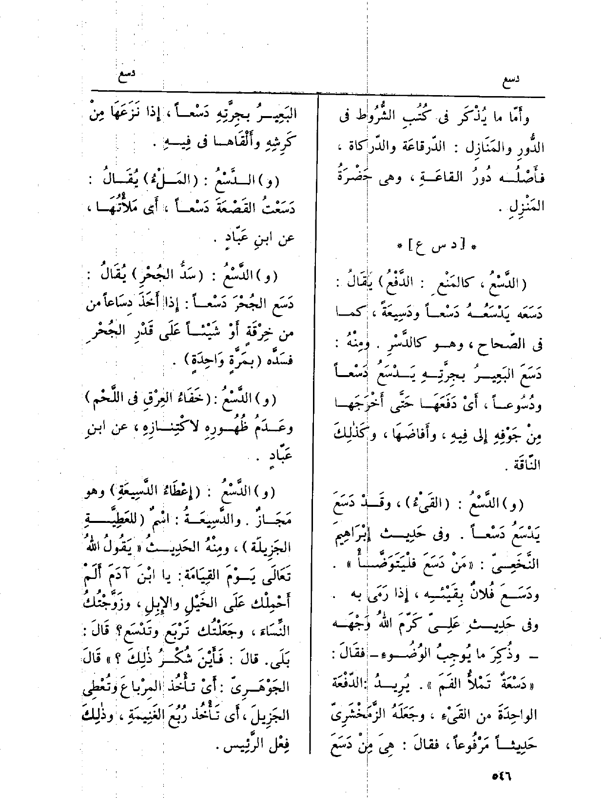 الدَّسْعُ، كالمَنْعِ: الدِّفْعُ يُقَالُ: دَسَعَه يَدْسَعُهُ دَسْعاً ودَسِيعَةً، كَمَا فِي الصّحاح، وَهُوَ كالدَّسْرِ. ومِنْهُ: دَسَعَ البَعِيرُ بجِرِّتِهِ يَدْسَعُ دَسْعاً ودُسُوعاً، أَيْ دَفَعَهَا حَتَّى أَخْرَجَها مِنْ جَوْفِهِ إِلى فِيهِ، وأَفاضَهَا، وكَذلِكَ النّاقَة. والدَّسْعُ: القَيْءُ، وقَدْ دَسَعَ يَدْسَعُ دَسْعاً. وَفِي حَدِيث إِبْرَاهِيمَ النَّخَعِيّ: مَنْ دَسَعَ فلْيَتَوَضَّأْ. ودَسَعَ فُلانٌ بِقَيْئِه، إِذا رَمَى بِهِ. وَفِي حَدِيثِ عَلَيّ كَرّمَ اللهُ وَجْهَه وذُكِرَ مَا يُوجِبُ الوُضُوءِ فقَالَ: دَسْعَةٌ تَمْلاُ الفَمَ. يُرِيدُ: الدّفْعَة الواحِدَةَ من القَيْءِ، وجَعَلَهُ الزَّمَخْشَرِيّ حَدِيثاً مَرْفُوعاً، فقالَ: هِيَ مِنْ دَسَعَ البَعِيرُ بجِرَّتِهِ دَسْعاً، إِذا نَزَعَهَا مِنْ كَرِشِهِ وأَلْقَاها فِي فِيهِ.