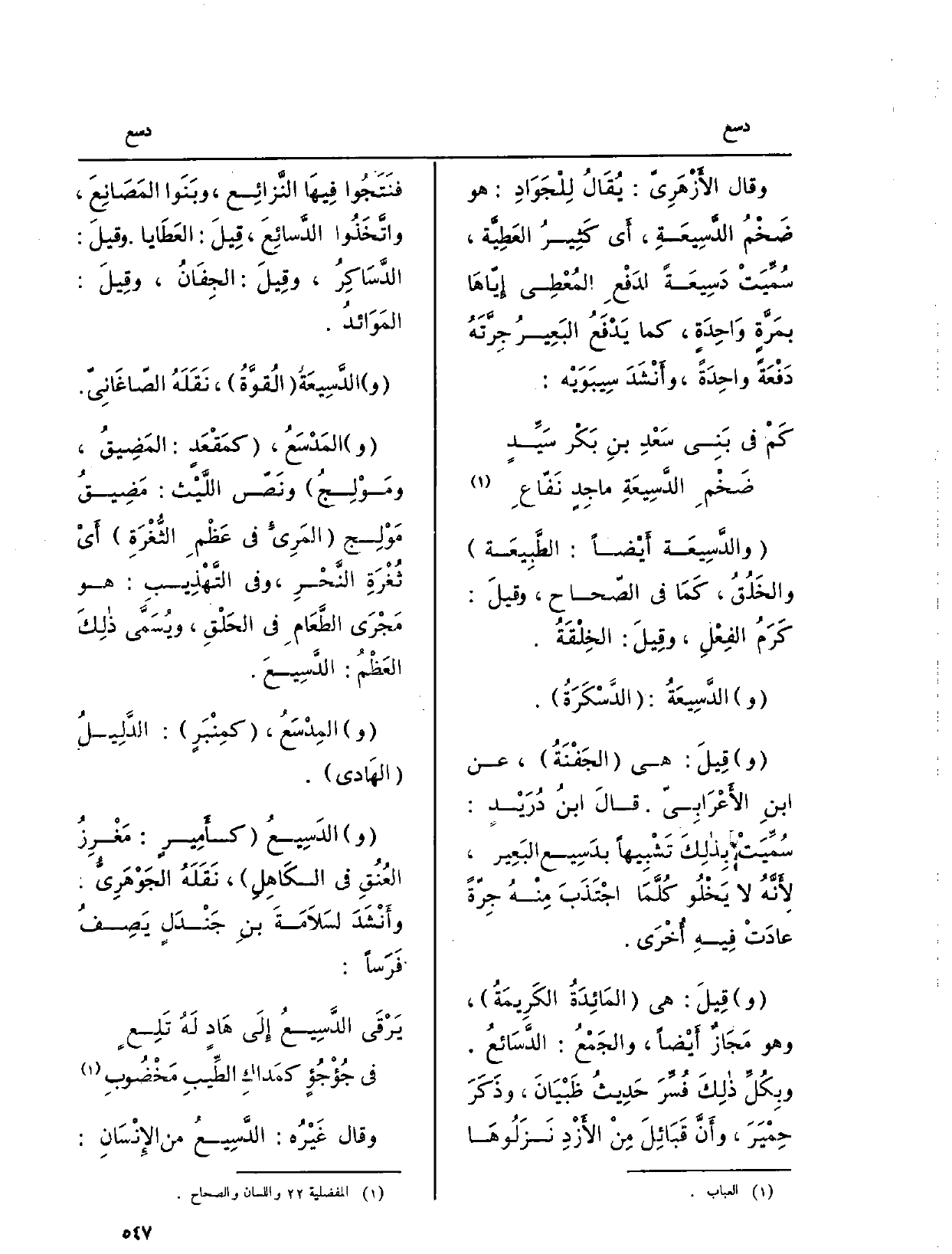 وَقَالَ الأَزْهَرِيّ: يُقَالُ لِلْجَوَادِ: هُوَ ضَخْمُ الدَّسِيعَةِ، أَي) كَثِيرُ العَطِيَّة، سُمِّيَتْ دَسِيعَةً لدَفْعِ المُعْطِي إِيّاهَا بمَرَّةٍ وَاحِدَةٍ، كَمَا يَدْفَعُ البَعِيرُ جِرَّتَهُ دَفْعَةً واحِدَةً، وأَنْشَدَ سِيبَوَيْه: