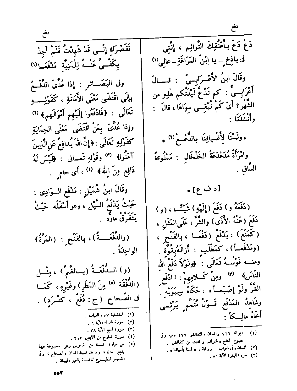 دَفَعَهُ ودَفَعَ إِلَيْهِ شَيْئاً، ودَفَعَ عَنْهُ الأَذَى والشَّرَّ، عَلَى المَثَلِ، كَمَنَعَ، يَدْفَعُ دَفْعَاً، بالفَتْحِ، ومَدْفَعاً، كمَطْلِبٍ: أَزَالَهُ بِقُوَّةٍ. وَمِنْه قَوْلُهُ تَعَالَى: ولَوْلاَ دَفْعُ اللهِ النّاسَ ومِنْ كَلامِهِمْ: ادْفَعِ الشَّرَّ ولَوْ إِصْبعاً، حَكَاهُ سِيبَوَيْه. وشَاهِدُ المَدْفَع قَوْلُ مُتَمِّمٍ يَرْثِي أَخَاهُ مالِكاً: