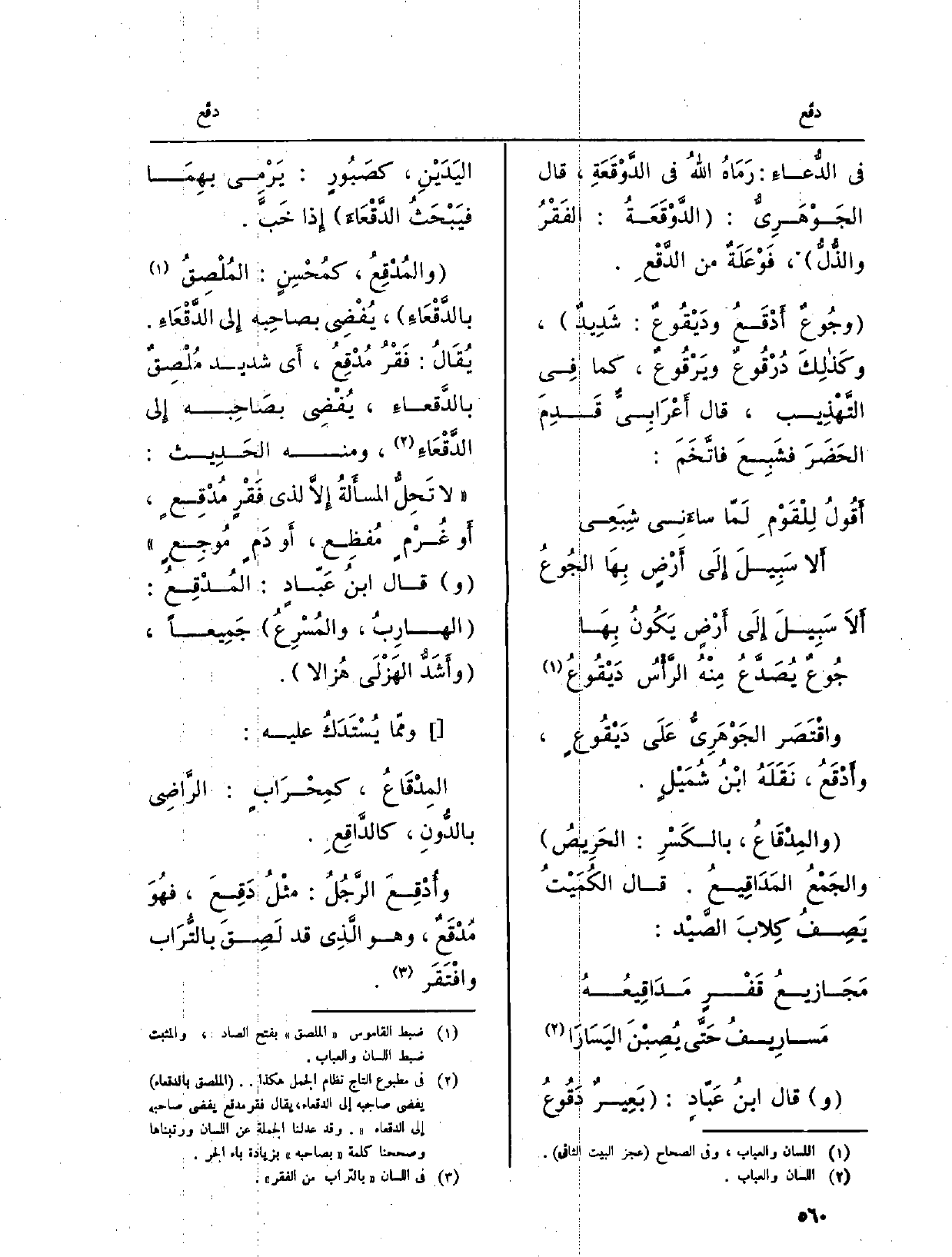 والمُدْقِعُ، كمُحْسِنٍ: المُلْصِقُ بالدَّقْعَاءِ، يُفْضِي بصاحِبه إِلى الدَّقْعَاءِ. يُقَالُ: فَقْرُ مُدْقِعُ، أَي شَدِيد) مُلْصِقٌ بالدَّقعاءِ، يُفْضِي بصَاحِبه إِلى الدَّقْعَاءِ، وَمِنْه الحَدِيث: لَا تَحِلُّ المسأَلةُ إِلاَّ لذِي فَقْرٍ مُدْقِعٍ، أَو غُرْمٍ مُفظِع، أَو دَمٍ مُوجِعٍ وَقَالَ ابنُ عَبّادٍ: المُدْقِعُ: الهارِبُ، والمُسْرِعُ جَمِيعاً، وأَشَدُّ الهَزْلَى هُزَالاً. وممّا يُسْتَدْرَكُ عَلَيْهِ: المِدْقَاعُ، كمِحْرَابٍ: الرَّاضِي بالدُّونِ، كالدَّاقِعِ. وأُدْقِعَ الرَّجُلُ: مِثْلُ دَقِعَ، فهُوَ مُدْقَعٌ، وَهُوَ الَّذِي قد لَصِقَ بالتُّرَاب وافْتَقَر.