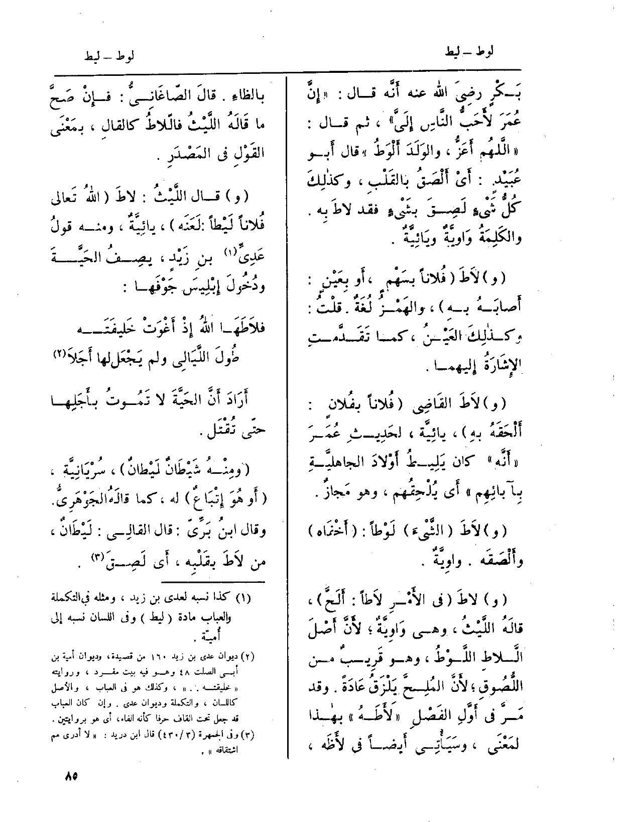 بَكْرٍ رضِيَ الله عَنهُ أَنَّه قَالَ: إِنَّ عُمَرَ لأَحَبُّ النَّاسِ إِلَيَّ، ثمَّ قَالَ: الَّلهُم أَعَزُّ، والوَلَدَ {أَلْوَطُ قَالَ أَبو عُبَيْدٍ: أَيْ أَلْصَقُ بالقَلْبِ، وكذلِكَ كُلُّ شَيْءٍ بشَيْءٍ فقد لاطَ بِهِ. والكَلِمَةُ وَاويَّةٌ ويَائِيَّةٌ. ولاَطَ فُلاناً بسَهْمٍ، أَو بِعَيْنٍ: أَصابَهُ بهِ، والهَمْزُ لُغَةٌ. قلْتُ: وكذلِكَ العَيْنُ، كَمَا تَقَدَّمتِ الإِشَارَةُ إِليهما.