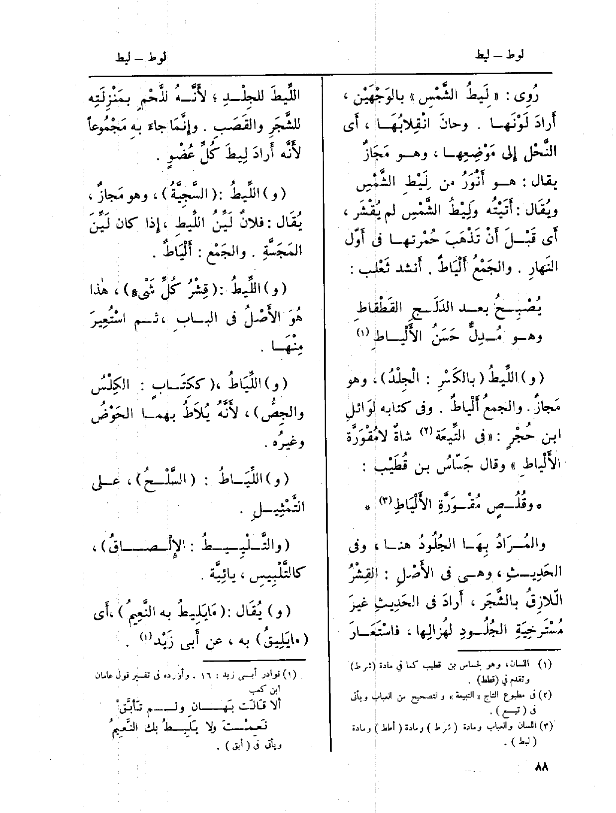 (و) {اللِّيطُ: قِشْرُ كُلِّ شَيْءٍ، هَذَا هُوَ الأَصْلُ فِي البابِ، ثمَّ أسْتُعِيرَ مِنْهَا. (و) } اللِّيَاطُ، ككِتَابٍ: الكِلْسُ والجِصُّ، لأَنَّهُ {يُلاَطُ بهما الحَوْضُ وغيرُه. والِّليَاطُ: السَّلْحُ، على التَّمْثِيلِ.)