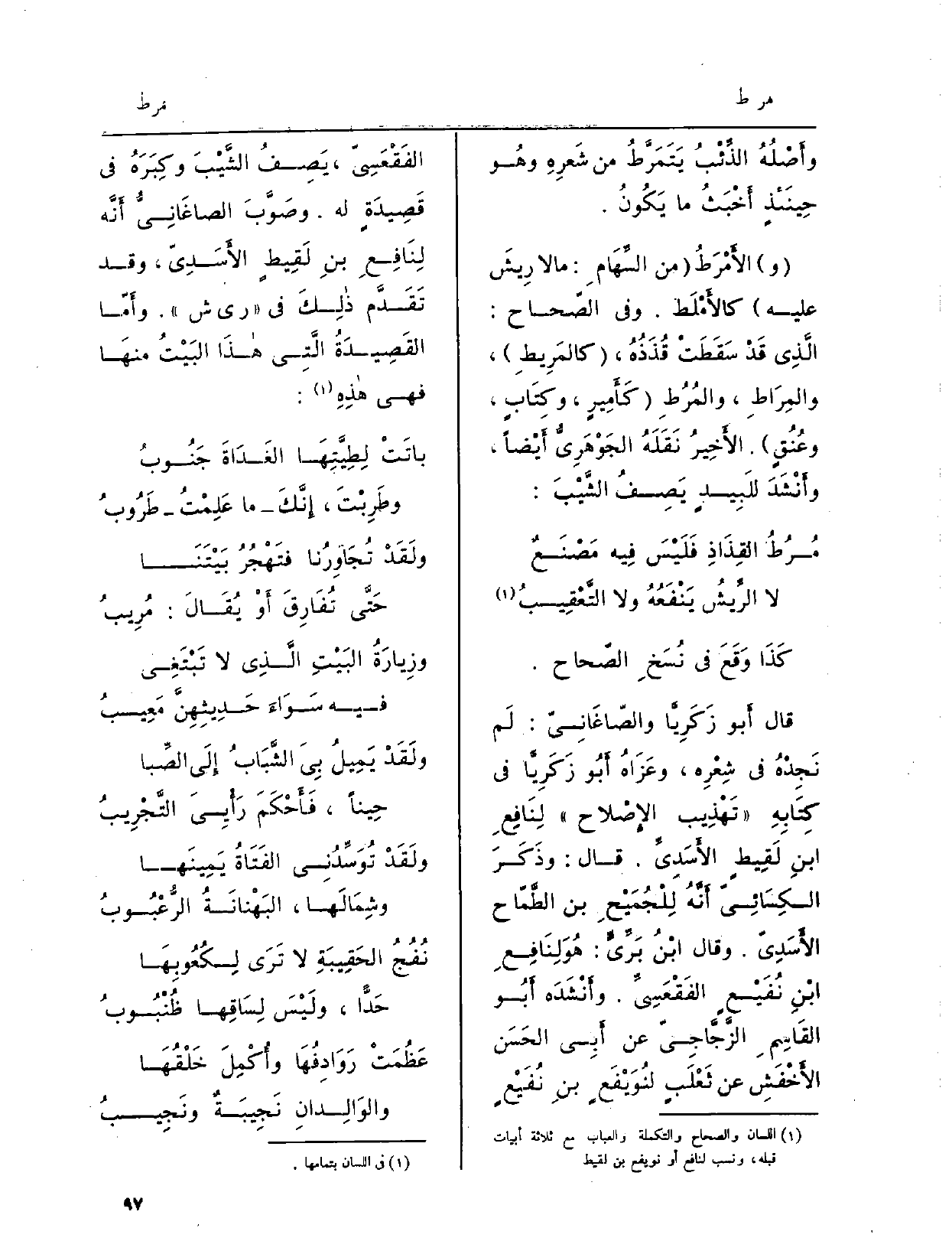 وصَوَّبَ الصاغَانِيُّ أَنَّه لِنَافِعِ بنِ لَقِيطٍ الأَسَدِيّ، وَقد تَقَدَّم ذلِكَ فِي ريش. وأَمّا القَصِيدَةُ الَّتِي هذَا البَيْتُ منهَا فَهِيَ هذِهِ: باتَتْ لِطِيَّتِهَا لغَدَاةَ جَنُوبُوطَرِبْتَ، إِنَّكَما عَلِمْتُطَرُوبُ
