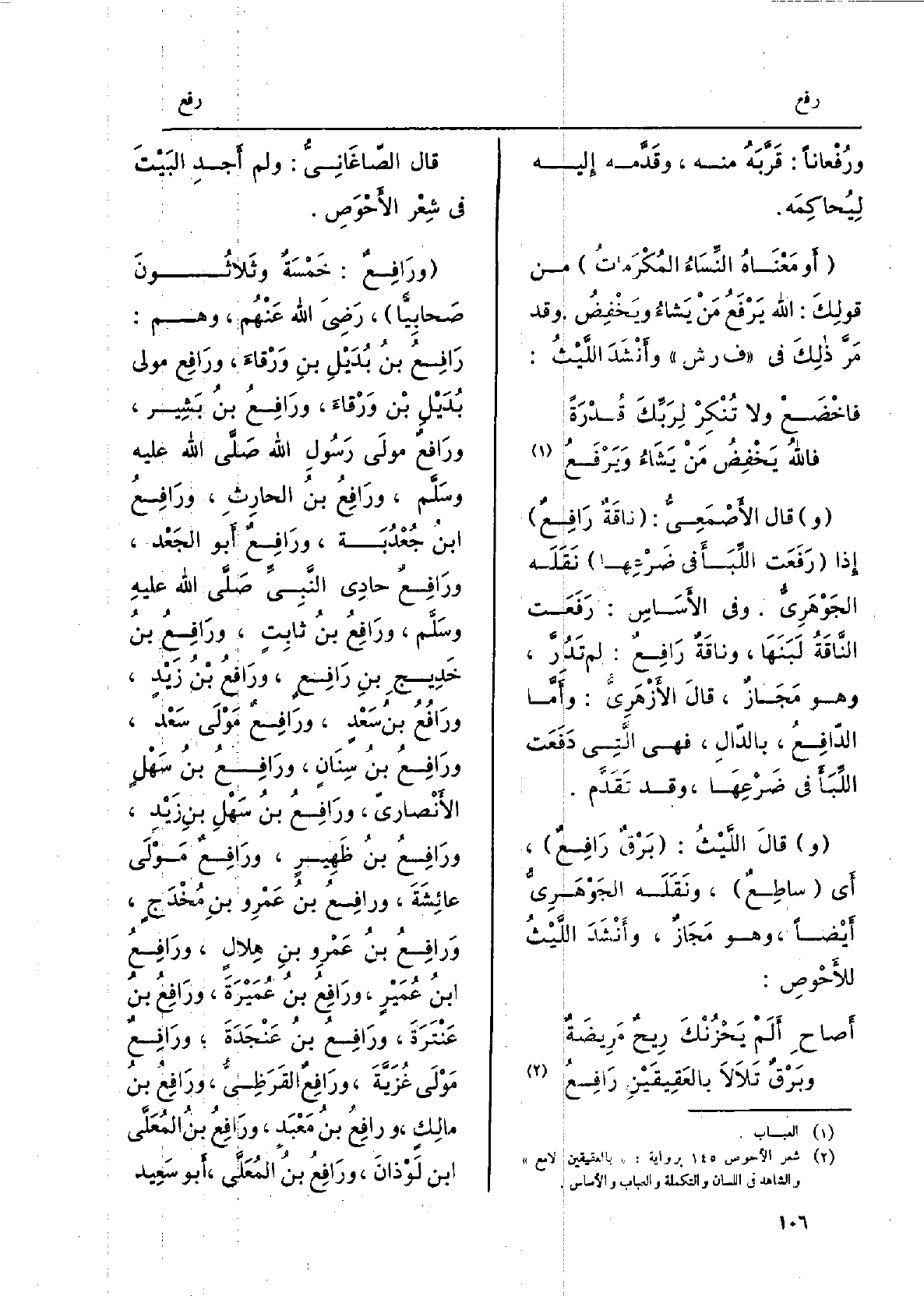 قَالَ الصَّاغانِيُّ: ولمْ أَجِدِ البيتَ فِي شِعر الأَحوَصِ. ورَافِعٌ: خَمسةٌ وثلاثونَ صحابِيّاً، رَضِي الله عَنْهُم، وهم: رافِعُ بن بُدَيل بن وَرْقاءَ، ورافعُ مَولى بُدَيْل بن وَرْقاءَ، ورافعُ بن بشير، ورافِع مَولى رَسُول الله صلّى الله عَلَيْهِ وسلَّم، وَرَافِع بنُ الْحَارِث، ورافعُ بنُ جُعْدُبَة، ورافعٌ أَبو الجَعْد، ورافِعٌ حادي النَّبيِّ صلّى الله عَلَيْهِ وسلَّم، ورافعُ بن ثابتٍ، ورافِعُ بنُ خَديجِ بنِ رافعٍ، ورافِعُ بنُ زَيْدٍ، ورافعُ بن سَعْدٍ، ورافعٌ مَولى سَعْد، وَرَافِع بن سِنانِ، ورافعُ بنُ سَهْلٍ الأَنصارِيّ، ورافه بن سهل بن زيدِ، ورافعُ بن ظَهيرٍ، ورافعٌ مَولى عائشَةَ، ورافِعُ بن عَمرو بنِ مُخْدَجٍ، ورافعُ بنِ عَمرو بنِ هلالٍ، ورافعُ بنُ عُمَيْرٍ، ورافعُ بنُ عُمَيْرَةَ، ورافعُ بن عَنترَةَ، ورافعُ بن عَنْجَدَةَ، ورافعُ مَولى غُزَيَّةَ، ورافعٌ القَرَظِيُّ، ورافعُ بن مالكٍ، ورافعُ بن مَعْبَدٍ، ورافعُ بنُ المُعَلَّى بن لَوذانَ، وَرَافِع بن المُعَلَّى أَبو سعيد،