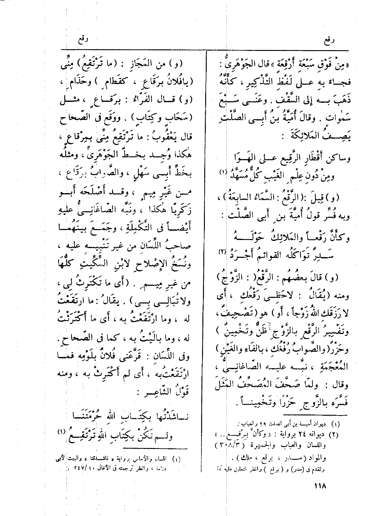 من فَوقِ سَبْعَةِ أَرْقِعَةٍ، قَالَ الجَوْهَرِيُّ: فجاءَ بِهِ على لَفظِ التَّذكِيرِ، كأَنَّه ذهبَ بِهِ إِلَى السَّقْفِ. وعَنَى سَبْعَ سَمواتٍ. وَقَالَ أُمَيَّةُ بنُ أَبي الصَّلْتِ يَصِفُ الملائكَةَ: