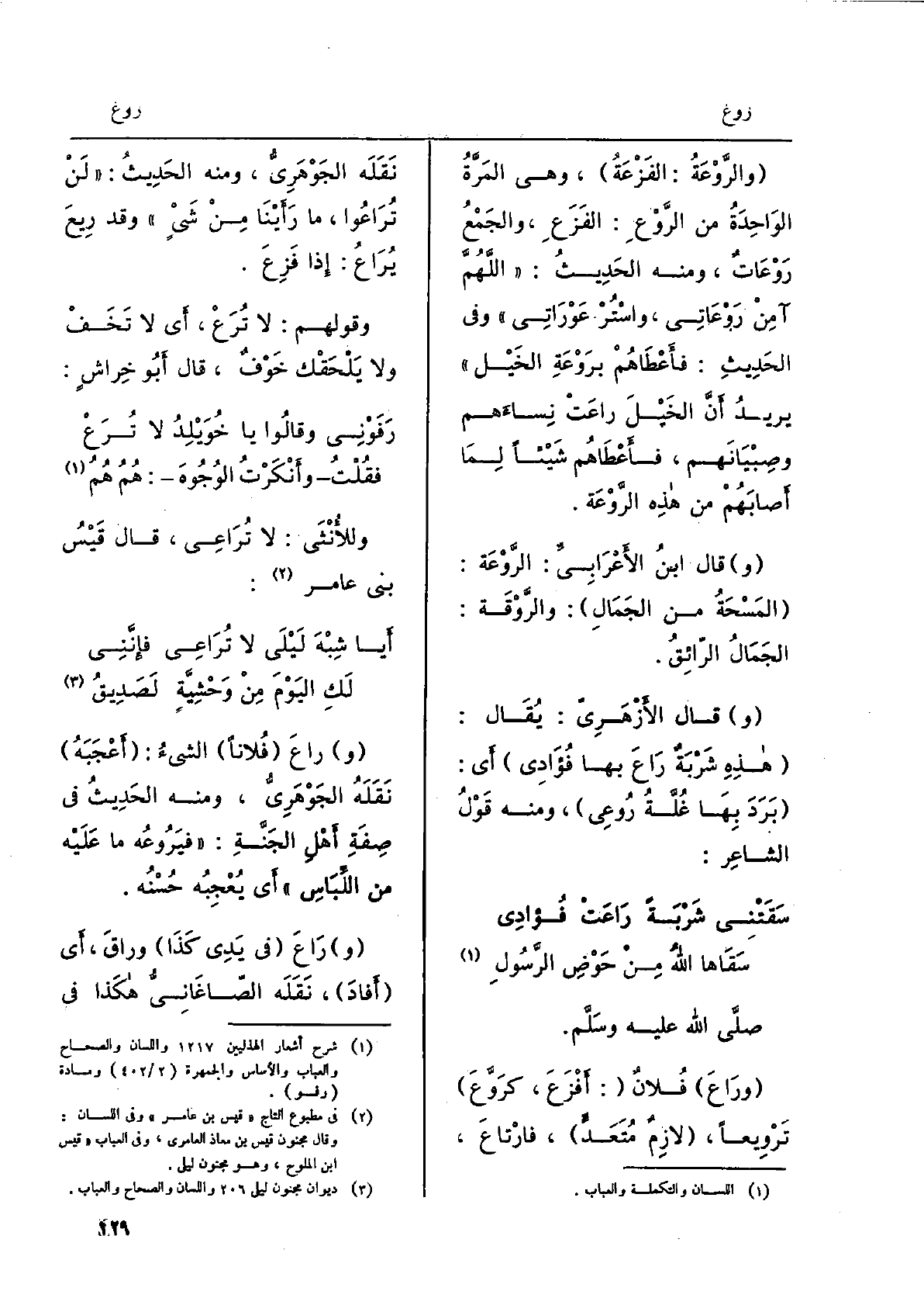صلّى الله عَلَيْهِ وسلَّم.} وراعَ فلانٌ: أَفْزَع، {كرَوَّعَ} تَرْوِيعاً، لازِمٌ مُتعَدٍّ، فارْتاعَ، نَقله الجَوْهَرِيّ، وَمِنْه الحَدِيث: لن {تُراعوا، مَا رَأَيْنا من شيءٍ وَقد} رِيعَ {يُراعُ: إِذا فَزِعَ. وَقَوْلهمْ: لَا} تُرَعْ، أَي لَا تَخَفْ وَلَا يَلْحَقْكَ خوفٌ، قَالَ أَبُو خِراشٍ: رَفَوْني وَقَالُوا يَا خُوَيْلِدُ لَا تُرَعْفقلتُوأَنكرْتُ الوجوهَ: همُ هُمُ وللأنثى: لَا تُراعي، قَالَ قَيْسُ بني عَامر: