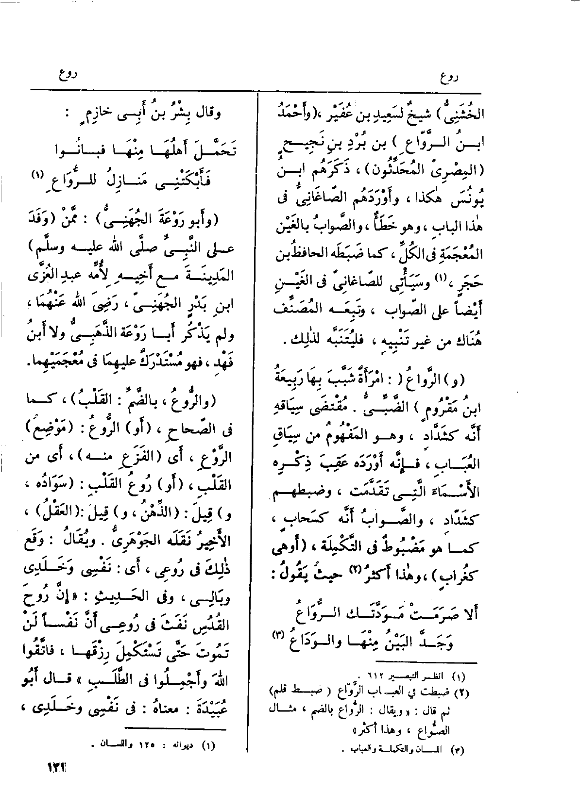 الخُشَنيُّ شيخٌ لسعيدِ بن عُفَيْر، وأحمدُ بنُ الرَّوَّاع بن بُرْدِ بنِ نَجيحٍ المِصريّ المُحدِّثون، ذَكَرَهم ابنُ يونُسَ هَكَذَا، وأَوْرَدَهم الصَّاغانِيّ فِي هَذَا الْبَاب، وَهُوَ خطأٌ، والصوابُ بالغَين المُعجَمةِ فِي الكلِّ، كَمَا ضَبَطَه الحافظُ بنُ حجَرٍ، وَسَيَأْتِي للصاغانيِّ فِي الغَينِ أَيْضا على الصَّوَاب، وتَبِعَهُ المُصَنِّف هُنَاكَ من غيرِ تَنْبِيه، فليُتَنَبَّه لذَلِك. (و) {الرَّواع: امرأةٌ شَبَّبَ بهَا رَبيعةُ بنُ مَقْرُومٍ الضَّبِّيِّ. مُقتَضى سِياقُه أنّه كشَدَّاد، وَهُوَ المفهومُ من سِياقِ العُباب، فإنّه أَوْرَدَه عَقِبَ ذِكرِه الأسماءَ الَّتِي تقدَّمَت، وضبطهم كشَدّادٍ، والصوابُ أنّه كسَحابٍ، كَمَا هُوَ مضبوطٌ فِي التكملة، أَو هِيَ كغُراب، وَهَذَا أَكثر حيثُ يَقُول: