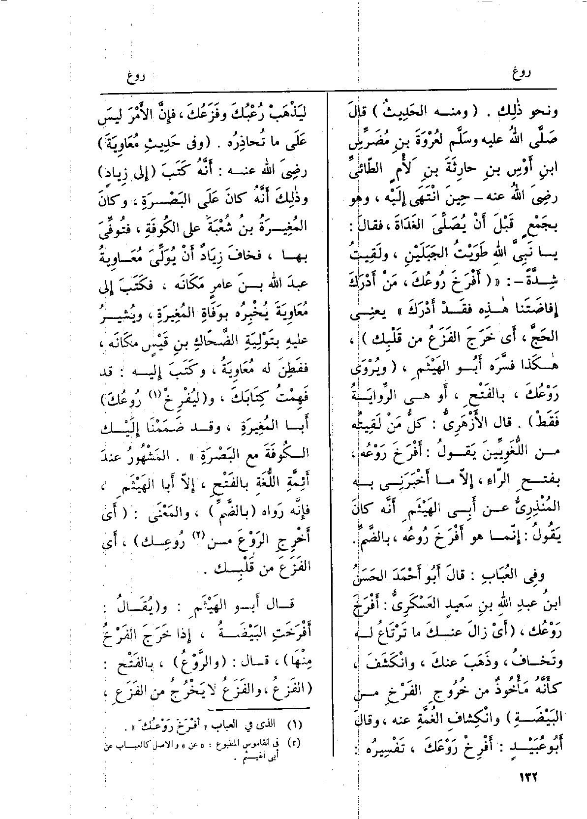 وَنَحْو ذَلِك، وَمِنْه الحَدِيث: قَالَ صلّى الله عَلَيْهِ وسلَّم لعُروَةَ بنِ مُضَرِّس بنِ أَوْسِ بنِ حارِثَةَ بنِ لأْمٍ الطائيِّ رَضِيَ اللهُ عَنهُ حِين انْتهى إِلَيْهِ، وَهُوَ بجَمْعٍ قبلَ أَن يُصلّي الغَداةَ، فَقَالَ: يَا نبيَّ اللهِ طَوَيْتُ الجَبلَيْن، ولَقِيتُ شِدَّةً: أَفْرَخَ {رُوعُكَ، مَن أَدْرَكَ إفاضَتَنا هَذِه فقد أَدْرَكَ عني الحَجَّ، أَي خَرَجَ الفزَعُ من قَلْبِك، هَكَذَا فَسَّرَه أَبُو الهَيثَم، ويُروى} رَوْعُك، بالفَتْح، أَو هِيَ الرِّوايةُ فَقَط. قَالَ الأَزْهَرِيّ: كلُّ من لَقِيتَه من اللُّغَويِّين يَقُول: أَفْرَخَ {رَوْعُه، بفتحِ الرَّاء، إلاّ مَا أَخْبَرني بِهِ المُنذِريُّ عَن أبي الهَيثَمِ أنّه كَانَ يَقُول: إنّما هُوَ أَفْرَخَ} رُوعُه، بالضَّمّ. وَفِي العُباب: قَالَ أَبُو أحمدَ الحسَنُ بنُ عَبْد الله بنِ سعيدٍ العَسكَريُّ: أَفْرَخَ رَوْعُك، أَي زالَ عنكَ مَا {تَرْتَاعُ لَهُ وتخافُ، وذهبَ عَنْك، وانْكشفَ، كأنّه مأخوذٌ من خروجِ الفَرْخِ من البَيضَةِ وانكِشافِ الغُمّةِ عَنْك، وَقَالَ أَبُو عُبَيْدٍ: أَفْرِخ رَوْعَك، تفسيرُه: ليَذهبْ رُعبُكَ وَفَزَعُك، فإنّ الأمرَ لَيْسَ على مَا تُحاذِرُه. وَفِي حديثِ مُعاوِيَةَ رَضِيَ اللهُ عَنهُ: أنّه كَتَبَ إِلَى زيادٍ وَذَلِكَ أنّه كَانَ على البَصْرةِ، وَكَانَ المُغيرَةُ بنُ شُعبةَ على الكُوفَةِ، فتُوفِّيَ بهَا، فخافَ زيادٌ أَن يُوَلِّيَ مُعاويةُ عَبْد الله بنَ عامِرٍ مكانَه، فَكَتَبَ إِلَى مُعاوِيةَ يُخبِرُه بوفاةِ المُغيرَة، ويُشيرُ عَلَيْهِ بتَولِيَةِ الضَّحَّاكِ بنِ قَيْسٍ مكانَه، ففَطِنَ لَهُ مُعاوِيَةُ، وَكَتَبَ إِلَيْهِ: قد فَهِمْتُ كِتابَكَ، وليُفْرِخْ رُوعُكَ أَبَا المُغيرَةِ، وَقد ضَمَمْنا إليكَ الكُوفةَ مَعَ البَصرةِ. المَشهورُ عندَ أئمَّةِ اللُّغَة بالفَتْح، إلاّ أَبَا الهَيثَم، فإنّه رواهٌ بالفَتْح، والمَعنى: أَي أَخْرِجْ الرَّوْعَ من رُوعِك، أَي الفزَعَ مِن قَلْبِك. قَالَ أَبُو الهَيثَمِ: وَيُقَال: أَفْرَخَتِ البَيضةُ، إِذا خَرَجَ الفَرخُ مِنْهَا، قَالَ:} والرَّوْعُ، بالفَتْح: الفزَعُ، والفزَعُ لَا يَخْرُجُ من الفزَعِ،