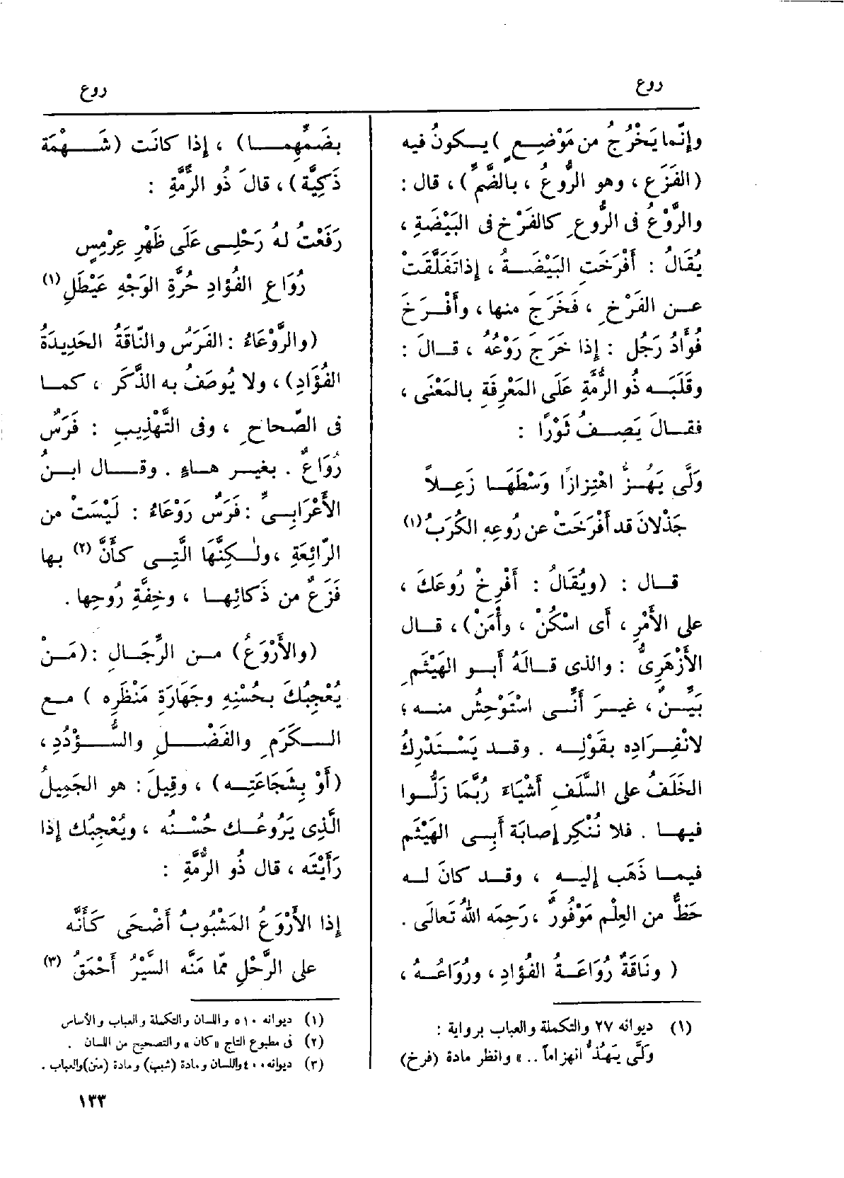 قَالَ: وَيُقَال: أَفْرِخْ رُوعَكَ، على الأمرِ، أَي اسْكُنْ، وأْمَنْ، قَالَ الأَزْهَرِيّ: وَالَّذِي قالَه أَبُو الهَيثَمِ) بَيِّنٌ، غيرَ أنِّي أَسْتَوحِشُ مِنْهُ لانْفِرادِه بقَولِه. وَقد يَسْتَدرِكُ الخلَفُ على السَّلَفِ أَشْيَاءَ رُبَّما زَلُّوا فِيهَا. فَلَا نُنكِر إصابَة أبي الهَيثمِ فِيمَا ذهبَ إِلَيْهِ، وَقد كَانَ لَهُ حَظٌّ من العِلمِ مَوْفُورٌ، رَحِمَه اللهُ تَعَالَى. وناقةٌ {رُوَاعَةُ الفُؤاد،} ورُواعُه، بضَمِّهما، إِذا كَانَت شَهْمَةً ذَكِيّةً، قَالَ ذُو الرُّمَّةِ: