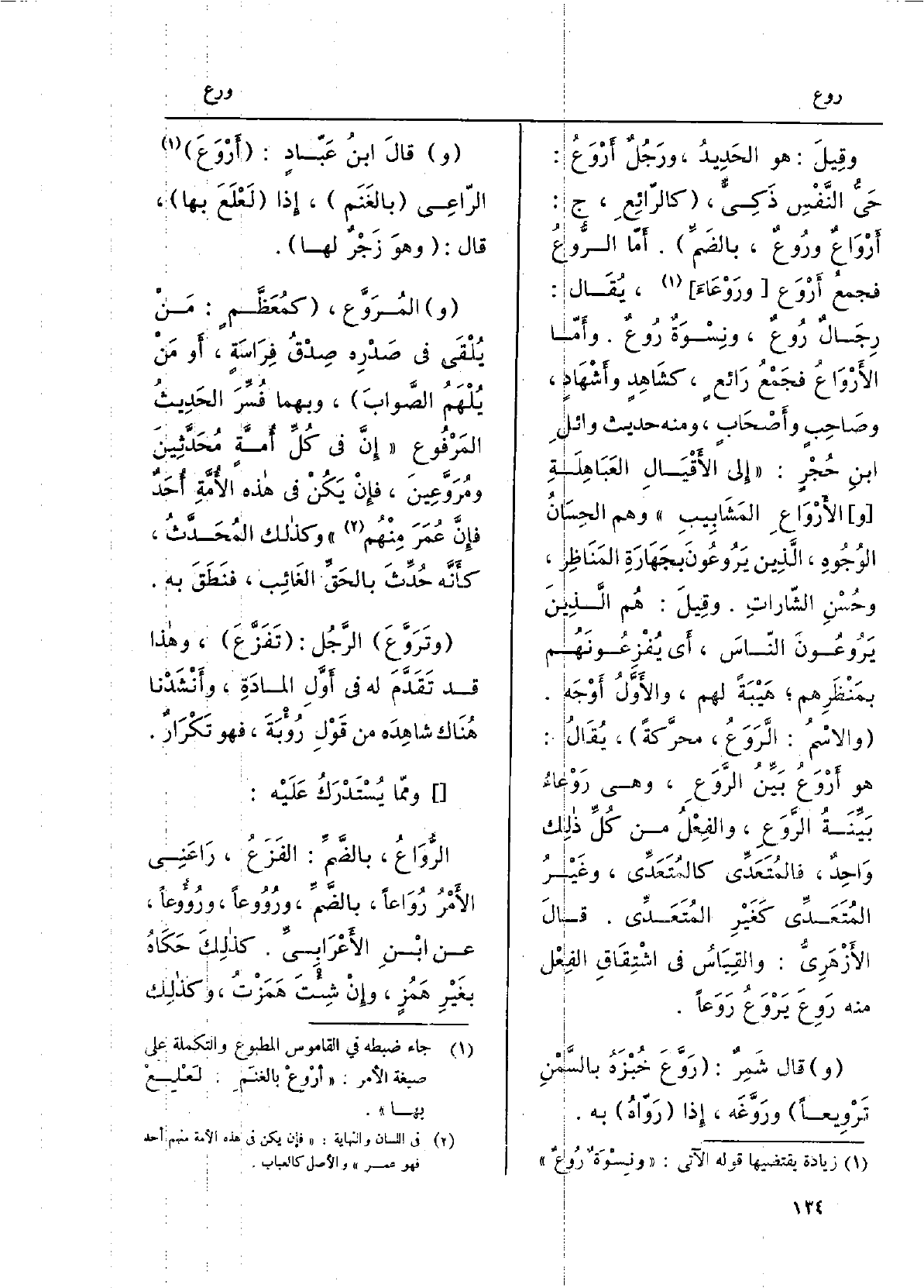 وَقيل: هُوَ الحَديد، ورجلٌ {أَرْوَعُ: حَيُّ النَّفْسِ ذَكِيٌّ،} كالرَّائِع، ج: {أَرْوَاعٌ} ورُوعٌ، بالضَّمّ. أمّا الرُّوعُ فجمعُ أَرْوَع {ورَوْعَاء، يُقَال: رِجالٌ رُوعٌ، ونِسوَةٌ رُوعٌ. وأمّا} الأَرْواعُ فجَمعُ رائِعٍ، كشاهِدٍ وأَشْهَاد، وصاحِبٍ وأَصْحَابٍ، وَمِنْه حديثُ وائِلِ بنِ حُجْرٍ: إِلَى الأَقْيالِ العَباهِلَةِ (و) {الأَرْواعِ المَشابيبِ. وهم الحِسانُ الْوُجُوه، الَّذين} يَرُوعونَ بجَهارَةِ المَناظرِ، وحُسنِ الشارات. وَقيل: هم الذينَ يَروعونَ الناسَ، أَي يُفزِعونَهم بمَنظَرِهم هَيْبَةً لَهُم، والأوّلُ أَوْجَه. والاسمُ: الرَّوَع، مُحرّكةً، يُقَال: هُوَ أَرْوَعُ بَيِّنُ الرَّوَعِ، وَهِي {رَوْعَاءُ بَيِّنَةُ الرَّوَعِ، والفِعلُ من كلِّ ذَلِك واحدٌ، فالمُتَعَدِّي كالمُتَعَدِّي. وغيرُ المُتَعَدِّي كغيرِ المُتَعَدِّي. قَالَ الأَزْهَرِيّ: والقياسُ فِي اشتِقاقِ الفِعلِ مِنْهُ} رَوِعَ {يَرْوَعُ} رَوَعَاً. قَالَ شَمِرٌ: {رَوَّعَ خُبْزَه بالسَّمْنِ} تَرْوِيعاً ورَوَّغَه، إِذا رَوّاهُ بِهِ. قَالَ ابنُ عَبّادٍ: {أَرْوَعَ الرَّاعِي بالغنَم، إِذا لَعْلَعَ بهَا، قَالَ: وَهُوَ زَجْرٌ لَهَا. (و) } المُرَوَّع، كمُعَظَّمٍ: مَن يُلقى فِي صَدْرِه صِدقُ فِراسَةٍ، أَو من يُلهَمُ الصوابَ، وَبِهِمَا فُسِّرَ الحديثُ المَرفوع: إنَّ فِي كلِّ أمَّةٍ مُحَدَّثينَ {ومُرَوَّعينَ، فإنْ يكُنْ فِي هَذِه الأُمَّةِ أُحَدٌّ فإنَّ عُمرَ مِنْهُم وَكَذَلِكَ المُحدَّث، كأنّه حُدِّثَ بالحَقِّ الغائبِ، فَنَطَقَ بِهِ.} وَتَرَوَّع الرجلُ: تفَزَّعَ، وَهَذَا قد تقدّمَ لَهُ فِي أوّلِ المادةِ، وأنشدْنا هناكَ شاهِدَه من قَوْلِ رُؤْبَةَ، فَهُوَ تَكْرَارٌ. ومِمّا يُسْتَدْرَك عَلَيْهِ: {الرُّوَاع، بالضَّمّ: الفزَعُ،} راعَني الأمرُ {رُواعاً، بالضَّمّ،} ورُووعاً،! ورُؤُوعاً، عَن ابْن الأَعْرابِيّ. كَذَلِك حكاهُ بغَيرِ هَمُزٍ، وَإِن شِئْتَ هَمَزْت، وَكَذَلِكَ