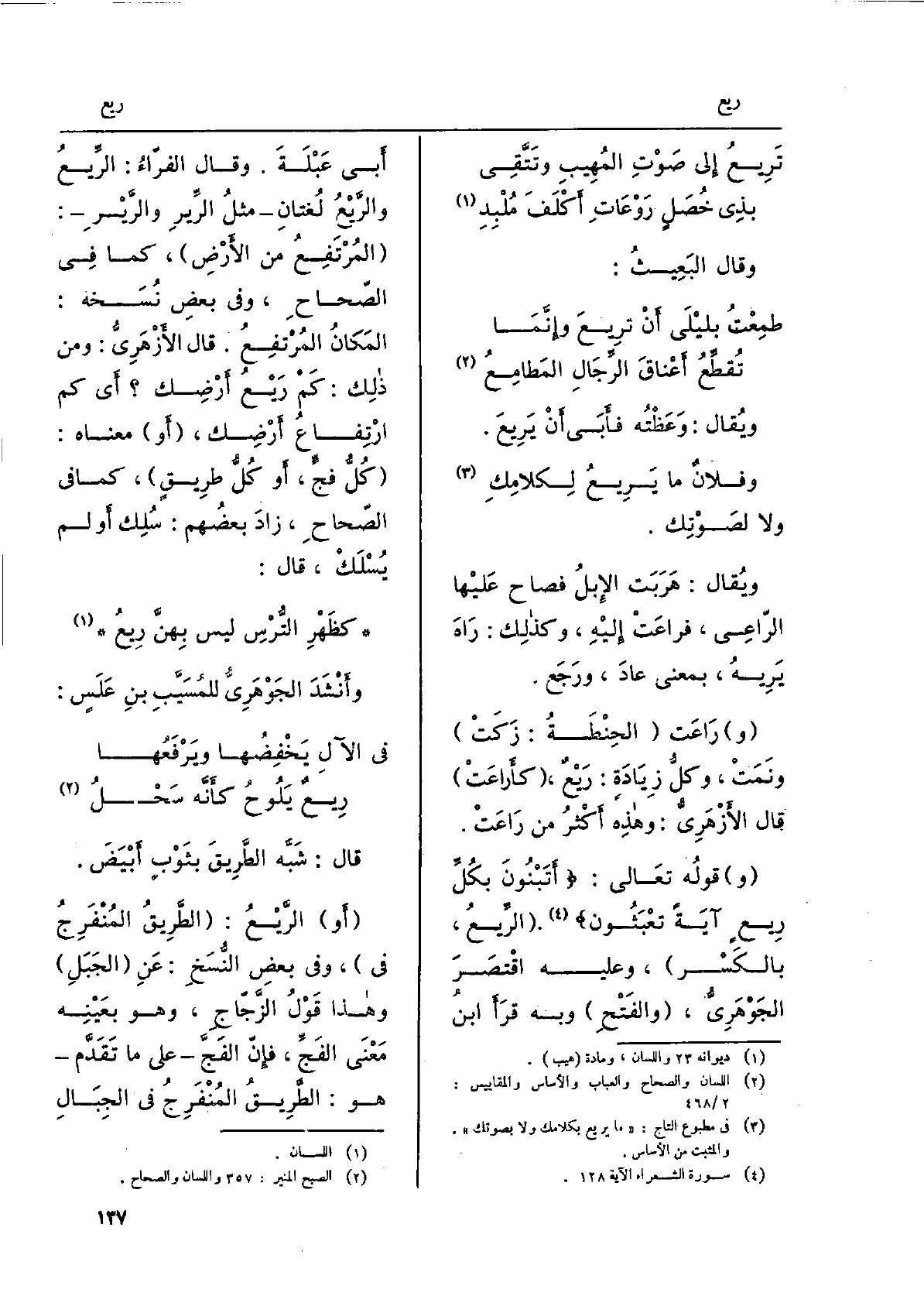 وَقَالَ الفَرّاءُ: الرِّيعُ {والرَّيْعُ لُغتان مثلُ الرِّيرِ والرَّيْر: المُرتَفِعُ من الأرضِ، كَمَا فِي الصِّحَاح، وَفِي بعضِ نُسخِه: المكانُ المُرتَفِع. قَالَ الأَزْهَرِيّ: وَمن ذَلِك: كم} رَيْعُ أَرْضِك أَي كم ارتِفاعُ أَرْضِك، أَو مَعْنَاهُ: كلُّ فَجٍّ، أَو كلُّ طريقٍ، كَمَا فِي الصِّحَاح، زادَ بَعْضُهم: سُلِكَ أَو لم يُسلَك، قَالَ: كَظَهْرِ التُّرْسِ لَيْسَ بهِنَّ رِيعُ وَأنْشد الجَوْهَرِيّ للمُسَيِّبِ بنِ علَسٍ: