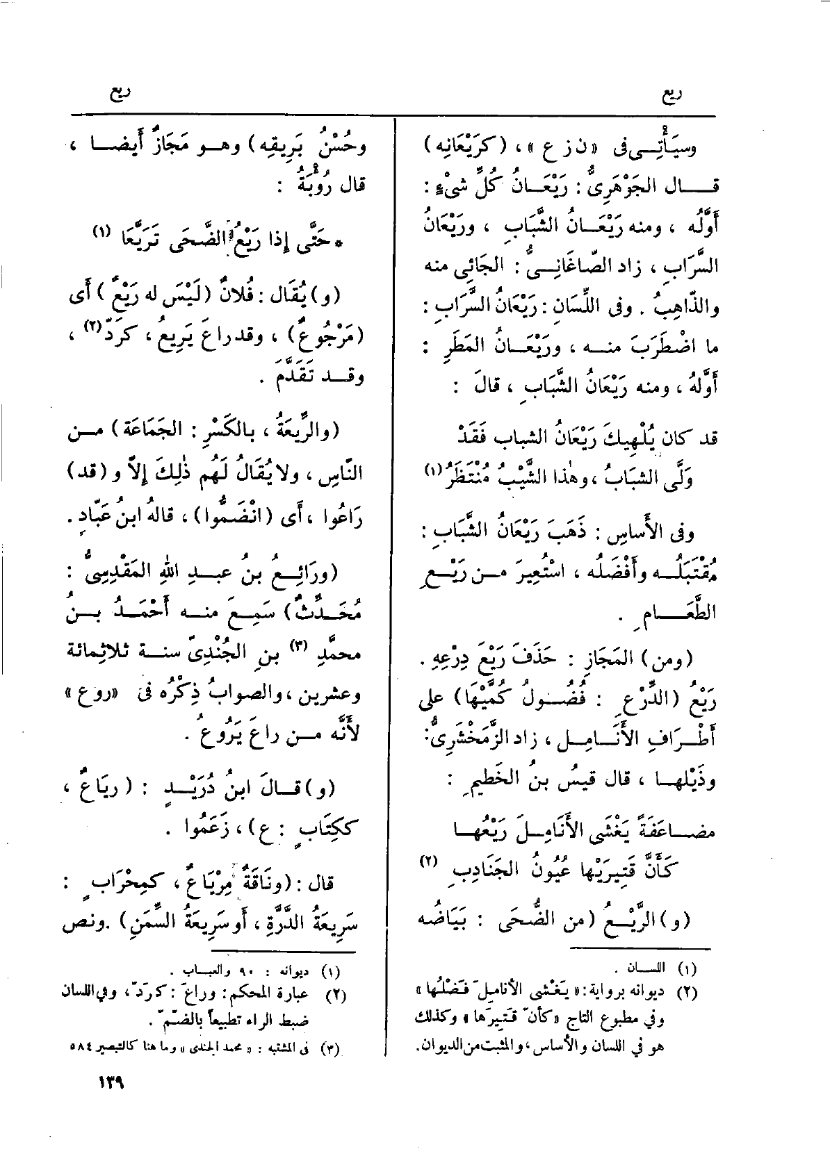 وَفِي الأساس: ذَهَبَ رَيْعَانُ الشبابِ: مُقتَبَلُه وأَفْضَلُه، استُعيرَ من رَيْعِ الطعامِ. منَ المَجاز: حَذَفَ رَيْعَ دِرعِه. رَيْعُ الدِّرْع: فُضولُ كُمَّيْها على أَطْرَافِ الأنامِل، زادَ الزَّمَخْشَرِيّ: وذَيْلها، قَالَ قَيْسُ بنُ الخَطيم: