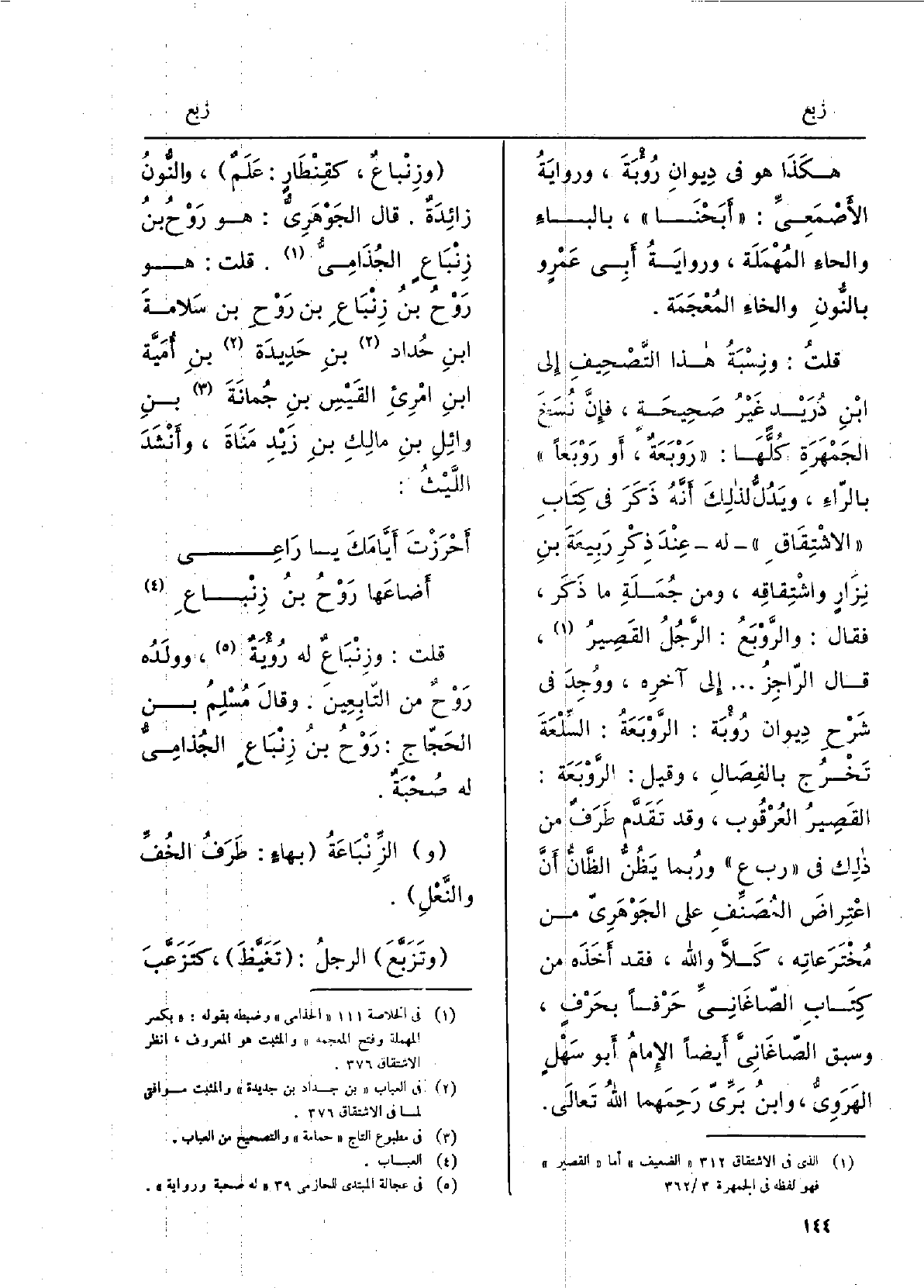 قلتُ: وزِنْباعٌ لَهُ رُؤيَةٌ، وولَدُه رَوْحٌ من التَّابِعين. وَقَالَ مُسلمُ بنُ الحَجّاج: رَوْحُ بنُ زِنْباعٍ الجُذاميُّ لَهُ صُحبةٌ. الزِّنْباعَة بهاءٍ: طَرَفُ الخُفِّ والنعلِ. وَتَزَبَّعَ الرجُلُ: تغَيَّظَ، كَتَزَعَّب