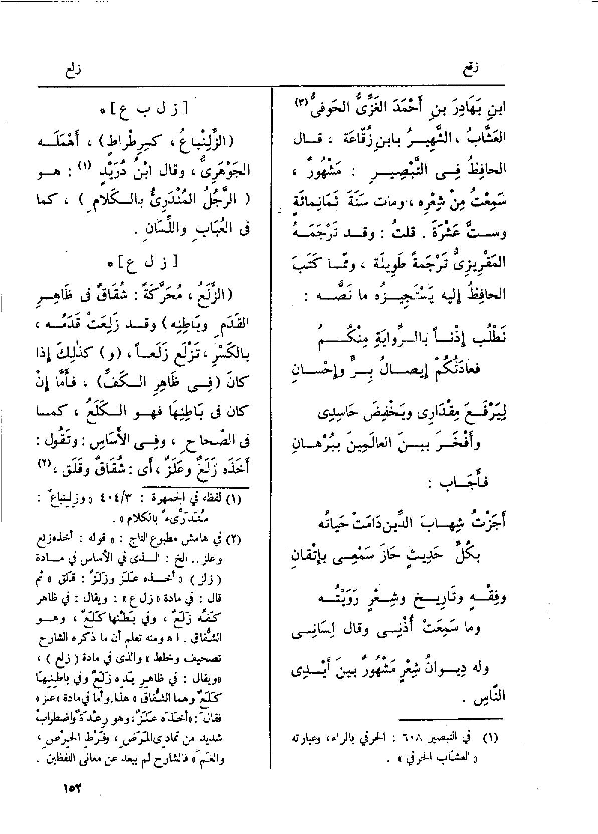 بنِ بَهادِرَ بنِ أحمدَ الغَزِّيُّ الحَوفيُّ العَشّاب، الشهيرُ بابنِ زُقّاعَةَ، قَالَ الحافظُ فِي التبصير: مَشْهُورٌ، سَمِعْتُ من شِعرِه، وَمَات سنةَ ثمانمائةٍ وستَّ عَشْرَةَ. قلتُ: وَقد تَرْجَمَهُ المَقْريزيُّ تَرْجَمةً طَوِيلَة. وممّا كَتَبَ الحافظُ إِلَيْهِ يَسْتَجيزُه مَا نَصُّه: