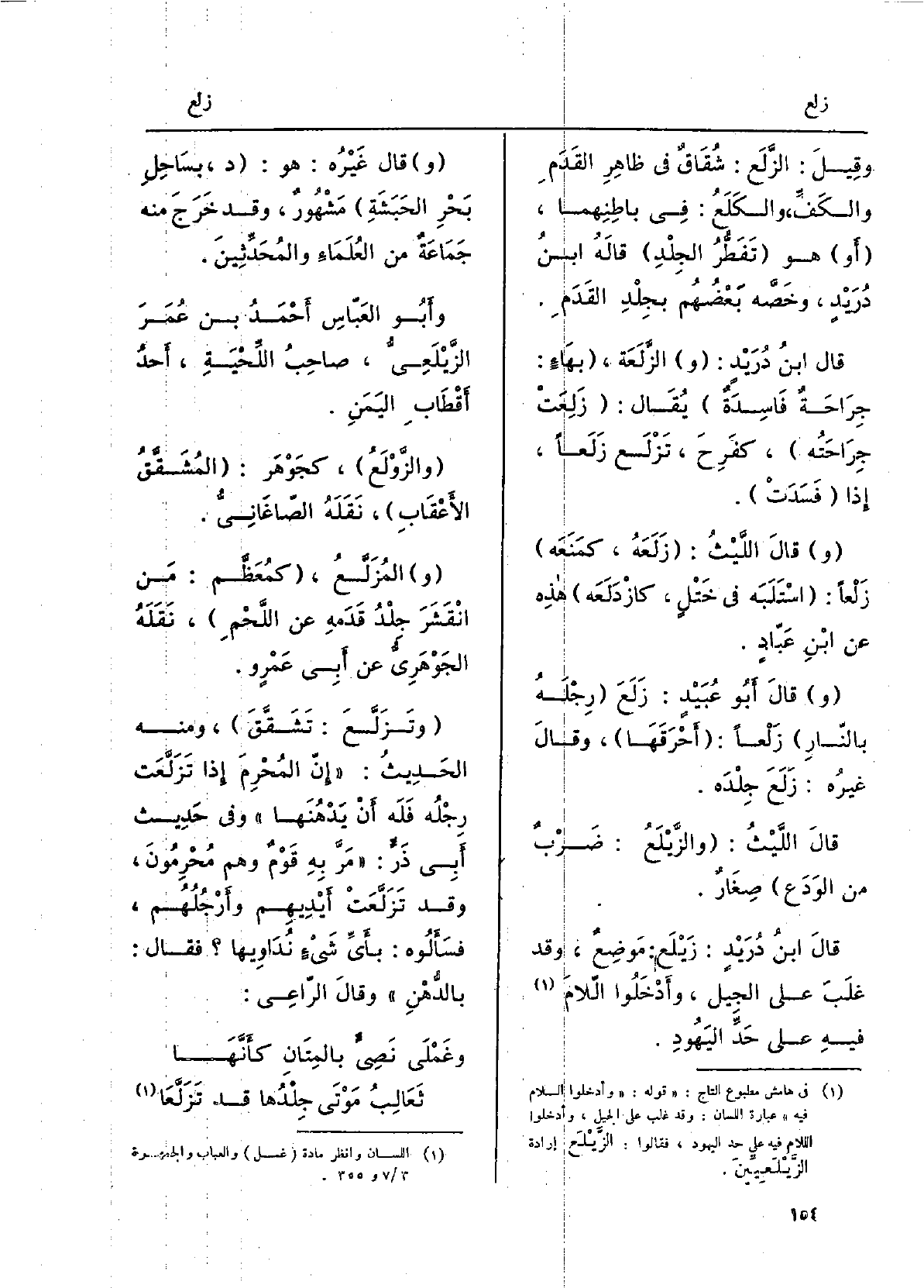 وَقيل: الزَّلَع: شُقاقٌ فِي ظاهرِ القدَمِ والكَفِّ، والكلَعُ: فِي باطنِهِما، أَو هُوَ تفَطُّرُ الجِلدِ قَالَه ابْن دُرَيْدٍ، وخَصَّه بَعْضُهم بجِلدِ القدَم. قَالَ ابْن دُرَيْدٍ: الزَّلَعة، بهاءٍ: جِراحَةٌ فاسِدَةٌ يُقَال: زَلِعَتْ جِراحَتُه، كفَرِحَ، تَزْلَعُ زَلَعَاً، إِذا فَسَدَتْ. قَالَ الليثُ: زَلَعَه، كَمَنَعه زَلْعَاً: اسْتَلبَه فِي خَتْلٍ، كازْدَلَعه هَذِه عَن ابْن عَبَّادٍ. قَالَ أَبُو عُبَيْدٍ: زَلَعَ رِجْلَه بالنارِ زَلْعَاً: أَحْرَقَها، وَقَالَ غيرُه: زَلَعَ جِلدَه. قَالَ الليثُ: والزَّيْلَع: ضَرْبٌ من الودَعِ صِغارٌ. قَالَ ابْن دُرَيْدٍ: زَيْلَع: مَوْضِعٌ، وَقد غَلَبَ على الْجَبَل، وأدخلوا اللامَ فِيهِ على حَدِّ اليَهود. قَالَ غيرُه: هُوَ: د، بساحلِ بَحْرِ الحَبَشةِ مَشْهُورٌ، وَقد خرجَ مِنْهُ جَماعةٌ من العُلَماءِ والمُحدِّثين. وَأَبُو العَبّاسِ أحمدُ بن عُمرَ الزَّيْلَعيُّ، صاحِبُ اللِّحْيَةِ، أحدُ أَقْطَابِ الْيمن. والزَّوْلَع، كَجَوْهَرٍ: المُشَقَّقُ الأَعْقابِ، نَقَلَه الصَّاغانِيّ. المُزَلَّع، كمُعَظَّم: مَن انْقَشرَ جِلدُ قدَمِه عَن اللَّحم، نَقَلَه الجَوْهَرِيّ عَن أبي عمروٍ. وَتَزَلَّعَ: تشَقَّقَ، وَمِنْه الحديثُ: إنّ المُحْرِمَ إِذا تزَلَّعَت رِجلُه فَلهُ أَن يَدْهُنَها وَفِي حديثِ أبي ذَرٍّ: مرَّ بِهِ قَومٌ وهم مُحرِمون، وَقد تزَلَّعَتْ أَيْديهم وأرجُلُهم، فَسَأَلُوهُ: بأيِّ شيءٍ نُداويها فَقَالَ: بالدُّهْن. وَقَالَ الرَّاعِي:
