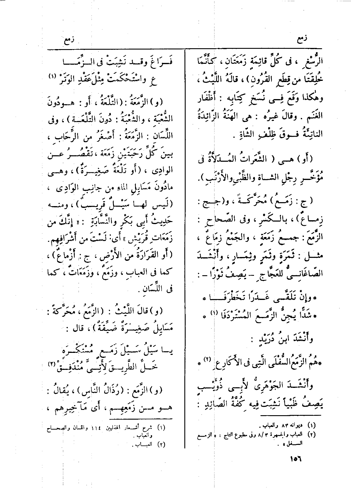وَأنْشد ابْن دُرَيْدٍ: همُ الزَّمَعُ السُّفلى الَّتِي فِي الأَكارِعِ وَأنْشد الجَوْهَرِيّ لأبي ذُؤَيْبٍ يصفُ ظَبْيَاً نَشِبَت فِيهِ كُفَّةُ الصائدِ: