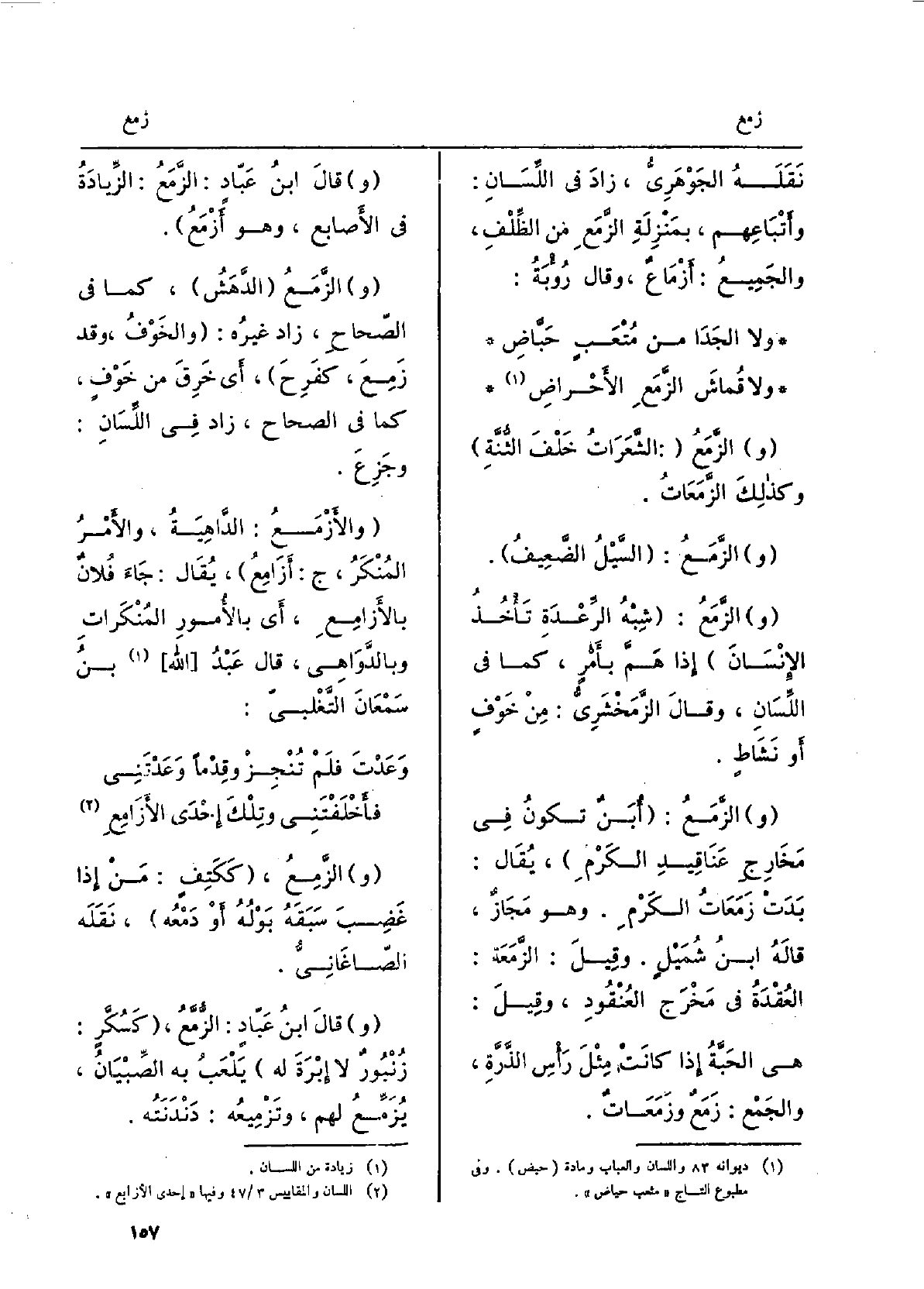 الزَّمَع: الشَّعَراتُ خَلْفَ الثُّنَّةِ وَكَذَلِكَ الزَّمَعات. الزَّمَع: السَّيْلُ الضَّعِيف. الزَّمَع: شِبهُ الرِّعْدَةِ تأخذُ الإنسانَ إِذا هَمَّ بأمرٍ، كَمَا فِي اللِّسان، وَقَالَ الزَّمَخْشَرِيّ: مِن خوفٍ أَو نَشاطٍ. الزَّمَع: أُبَنٌ تكونُ فِي مَخارجِ عَناقيدِ الكَرْم. يُقَال: بَدَتْ زَمَعَات الكَرْم. وَهُوَ مَجاز، قَالَه ابنُ شُمَيْلٍ. وَقيل: الزَّمَعة: العُقدَةُ فِي مَخْرَجِ العُنقودِ، وَقيل: هِيَ الحَبّةُ إِذا كَانَت مِثلَ رَأْسِ الذَّرَّةِ، والجَمع: زَمَعٌ وزَمَعَاتٌ. قَالَ ابنْ عَبَّادٍ: الزَّمَع: الزيادةُ فِي الْأَصَابِع، وَهُوَ أَزْمَعُ. الزَّمَع الدَّهَش، كَمَا فِي الصِّحَاح، زَاد غيرُه: والخَوف، وَقد زَمِعَ، كفَرِحَ، أَي خَرِقَ من خوفٍ، كَمَا فِي الصِّحَاح، زادَ فِي اللِّسان: وجَزِعَ. والأَزْمَع: الداهِيَة، والأمرُ المُنكَر، ج: أزامِع، يُقَال: جاءَ فلانٌ بالأَزامِع، أَي بالأمورِ المُنكَراتِ وبالدَّواهي، قَالَ عَبْد الله بنُ سَمْعَانَ التَّغْلِبيّ: