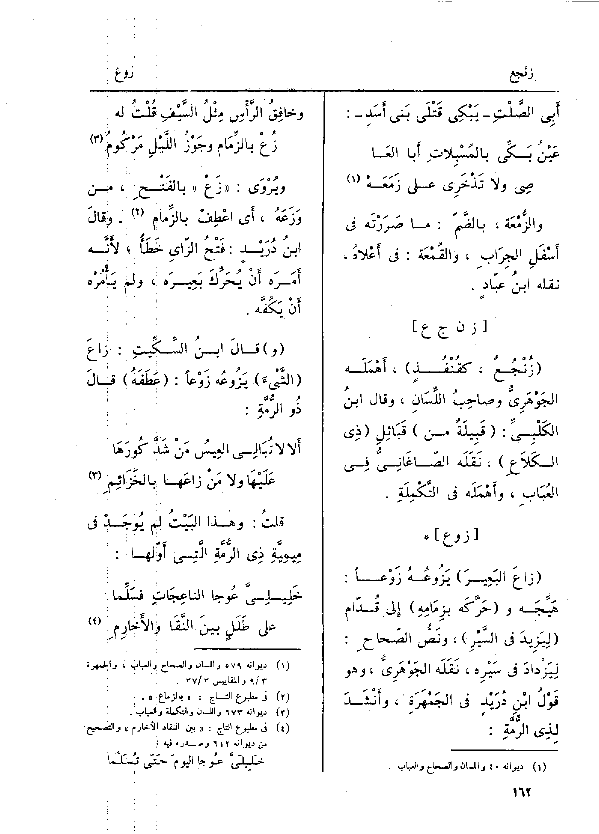 ويُروى: {زَعْ بالفَتْح، من} وَزَعَه، أَي اعْطِفْ بالزِّمام. وَقَالَ ابْن دُرَيْدٍ: فَتْحُ الزَّاي خطأٌ لأنّه أَمَرَه أَن يُحرِّكَ بَعيرَه، وَلم يَأْمُرْه أَن يَكُفَّه. قَالَ ابْن السِّكِّيت: زاعَ الشيءَ يَزُوعُه زَوْعَاً: عَطَفَه، قَالَ ذُو الرُّمَّة: