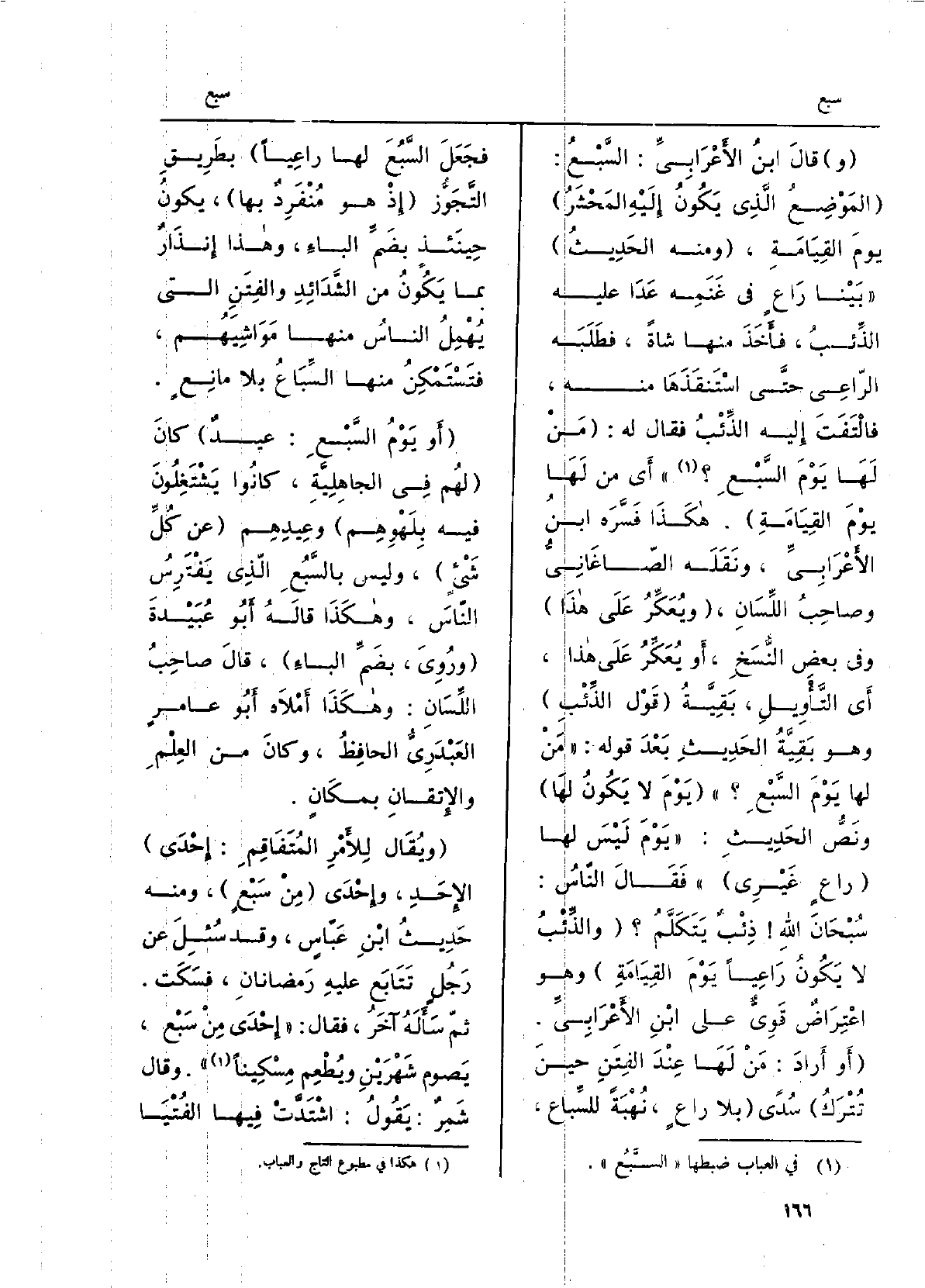قَالَ ابْن الأَعْرابِيّ: السَّبْع: المَوضِعُ الَّذِي يكونُ إِلَيْهِ المَحشَر يومَ الْقِيَامَة، وَمِنْه الحديثُ: بَيْنَا راعٍ فِي غنَمِه عدا عَلَيْهِ الذِّئبُ، فَأَخَذ مِنْهَا شَاة، فَطَلَبه الرَّاعِي حَتَّى اسْتَنقَذَها مِنْهُ، فالْتَفتَ إِلَيْهِ الذِّئبُ فَقَالَ لَهُ: مَن لَهَا يومَ السَّبْعِ أَي من لَهَا يومَ الْقِيَامَة. هَكَذَا فَسَّرَه ابْن الأَعْرابِيّ، وَنَقَله الصَّاغانِيّ وصاحبُ اللِّسان، ويُعَكِّرُ على هَذَا وَفِي بعضِ النّسخ، أَو يُعَكِّرُ على هَذَا، أَي التَّأْوِيل، بقِيَّةُ قَول الذِّئب وَهُوَ بقيَّةُ الحديثِ بعدَ قولِه: مَن لَهَا يَوْمَ السَّبْعِ يَوْمَ لَا يكونُ لَهَا ونَصُّ الحَدِيث: يَوْمَ لَيْسَ لَهَا راعٍ غَيْرِي فَقَالَ النَّاس: سُبحانَ الله ذِئبٌ يَتَكَلَّم والذئبُ لَا يكونُ راعِياً يَوْمَ القيامةِ وَهُوَ اعتِراضٌ قوِيٌّ على ابْن الأَعْرابِيّ. أَو أرادَ: مَن لَهَا عندَ الفِتَنِ حِين تُترَكُ سُدىً بِلَا راعٍ، نُهبَةً للسِّباع، فَجَعَلَ السَّبُعَ لَهَا راعِياً بطريقِ التَّجَوُّز إِذْ هُوَ مُنفرِدٌ بهَا، يكونُ حينَئِذٍ بضمِّ الْبَاء، وَهَذَا إنذارٌ بِمَا يكونُ من الشدائدِ والفِتَنِ الَّتِي يُهمِلُ الناسُ مِنْهَا مَواشِيَهُم، فَتَسْتَمْكِنُ مِنْهَا السِّباعُ بِلَا مانِعٍ. أَو يومُ السَّبْعِ: عيدٌ كانَ لَهُم فِي الجاهليّةِ، كَانُوا يَشْتَغِلون فِيهِ بلَهْوِهِم وعيدِهم عَن كلِّ شيءٍ، وَلَيْسَ بالسَّبُعِ الَّذِي يَفْتَرِسُ الناسَ، وَهَكَذَا قالَه أَبُو عُبَيْدةَ ورُوي، بضمِّ الباءِ، قَالَ صاحبُ اللِّسان: وَهَكَذَا أمْلاهُ أَبُو عامرٍ العَبْدَرِيُّ الحافظُ، وَكَانَ من العِلمِ والإتقانِ بمكانٍ. وَيُقَال للأمرِ المُتَفاقِم: إِحْدَى الإحَد، وَإِحْدَى من سَبْعٍ، وَمِنْه حديثُ ابنِ عَبّاسٍ، وَقد سُئِلَ عَن رجلٍ تَتابَعَ عَلَيْهِ رَمَضَانان، فَسَكَتَ. ثمّ سَأَلَه آخَرُ، فَقَالَ: إحْدى مِن سَبْع، يصومُ شَهْرَيْن ويُطعِمُ مِسْكيناً. وَقَالَ شَمِرٌ: يَقُول: اشْتدَّتْ فِيهَا الفُتْيا