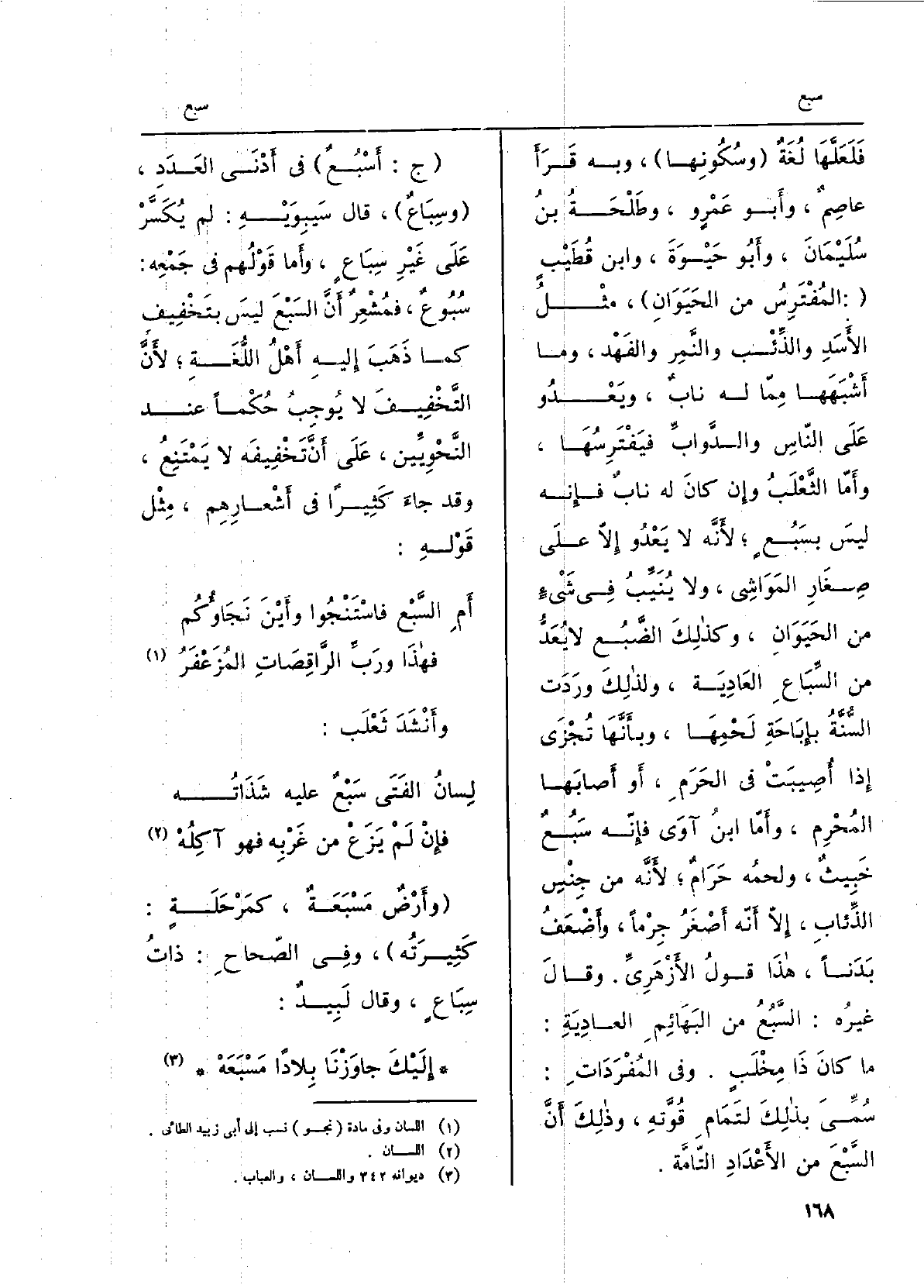 فَلَعَلَّها لغةٌ وسُكونِها، وَبِه قَرَأَ عاصِمٌ، وَأَبُو عمروٍ، وطَلْحَةُ بنُ سُلَيْمان، وَأَبُو حَيْوَةَ، وابنُ قُطَيْبٍ: المُفتَرِسُ من الحَيَوانِ، مثلُ الأسَدِ والذِّئبِ والنَّمِر والفَهد، وَمَا أَشْبَهها ممّا لَهُ نابٌ، ويَعْدُو على الناسِ والدّوابِّ فَيَفْتَرِسُها، وأمّا الثعلبُ وَإِن كَانَ لَهُ نابٌ فإنّه لَيْسَ بسَبُعٍ لأنّه لَا يَعْدُو إلاّ على صِغارِ المَواشي، وَلَا يُنَيِّبُ فِي شيءٍ من الحَيَوان، وَكَذَلِكَ الضَّبُع لَا يُعَدُّ من السِّباعِ العادِيَة، وَلذَلِك وَرَدَت السُّنَّةُ بإباحةِ لَحْمِها، وبأنَّها تُجْزَى إِذا أُصيبَت فِي الحرَم، أَو أصابَها المُحرِم، وأمّا ابنُ آوى فإنّه سَبُعٌ خَبيثٌ، ولحمُه حَرامٌ لأنّه من جِنسِ الذِّئابِ، إلاّ أنّه أَصْغَرُ جِرْماً، وأَضْعَفُ بَدَنَاً، هَذَا قولُ الأَزْهَرِيّ. وَقَالَ غيرُه: السَّبُعُ من البهائمِ العادِيَةِ: مَا كَانَ ذَا مَخْلَبٍ. وَفِي المُفرَدات: سُمِّي بذلك لتَمامِ قُوَّتِه، وَذَلِكَ أنَّ السَّبْعَ من الأَعْدادِ التّامَّةِ. ج: أَسْبُعُ فِي أدنى العدَد، وسِباع، قَالَ سِيبَوَيْهٍ: لم يُكَسَّرْ على غيرِ سِباعٍ، وأمّا قَوْلُهم فِي جَمْعِه: سُبوعٌ، فمُشعِرٌ أنَّ السَّبْعَ لَيْسَ بتَخفيفٍ كَمَا ذهبَ إِلَيْهِ أَهْلُ اللُّغَة لأنّ التَّخفيفَ لَا يُوجِبُ حُكماً عِنْد النَّحْوِيِّين، على أنّ تَخفيفَه لَا يَمْتَنِع، وَقد جاءَ كثيرا فِي أشعارِهم، مِثلَ قَوْلِه: