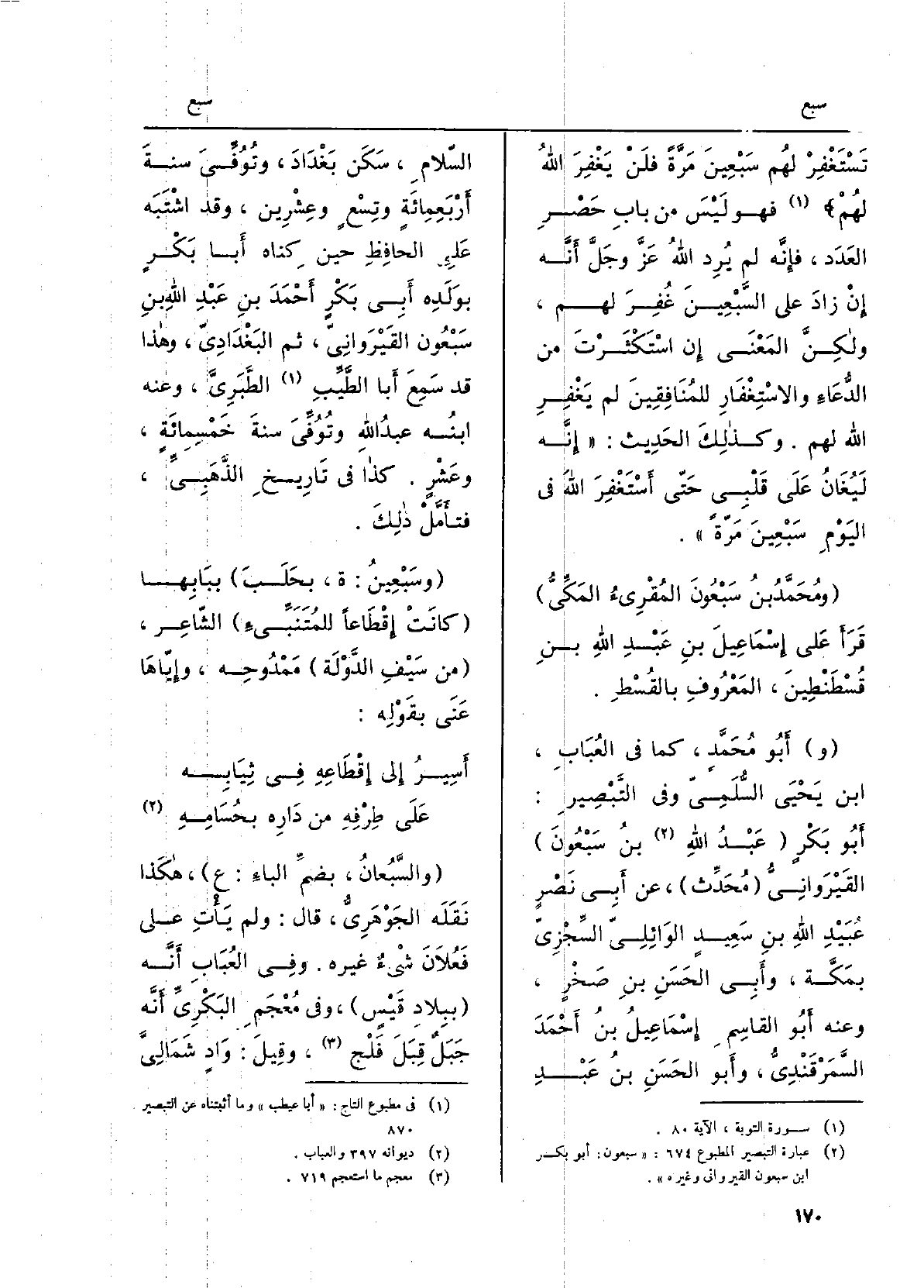 تَسْتَغْفِرْ لَهُم سَبْعِينَ مَرَّةً فَلَنْ يَغْفِرَ اللهُ لَهُم فَهُوَ لَيْسَ من بابِ حَصْرِ العدَد، فإنّه لم يُرِدْ اللهُ عزَّ وجلَّ أنّه إنْ زادَ على السَّبْعين غُفِرَ لَهُم، ولكنّ المَعنى إِن استَكثرْتَ من الدُّعاءِ والاستِغفارِ للمُنافقين لم يَغْفِرِ الله لَهُم. وَكَذَلِكَ الحَدِيث: إنّه ليُغانُ على قَلْبِي حَتَّى أَسْتَغْفِرَ اللهَ فِي اليَومِ سَبْعِين مَرّةً. وَمُحَمّد بنُ سَبْعُون المُقرِئُ المَكّيُّ قرأَ على إسماعيلَ بنِ عَبْد الله بنِ قُسْطَنطين، المعروفِ بالقُسْط. أَبُو محمدٍ، كَمَا فِي العُباب، ابْن يحيى السُّلَمِيّ وَفِي التبصير: أَبُو بكرٍ عَبْد الله بنُ سَبْعُون القَيْروانيُّ مُحدِّث، عَن أبي نَصْرٍ عُبَيْدُ اللهِ بنِ سعيدٍ الوائليّ السِّجْزِيّ بمَكَّة، وَأبي الحسَنِ بنِ صَخْرٍ، وَعنهُ أَبُو القاسمِ إسماعيلُ بنُ أحمدَ السَّمَرْقَنْديّ، وَأَبُو الحسَنِ بنُ عبدِ السَّلَام، سَكَنَ بَغْدَاد، وتُوفِّي سنةَ أربعمائةٍ وتِسعٍ وعِشرين، وَقد اشْتَبهَ على الحافظِ حِين كناه أَبَا بكرٍ بولَدِه أبي بكرٍ أحمدَ بنِ عَبْد الله بنِ سَبْعُون القَيْروانيّ، ثمّ البغداديّ، وَهَذَا قد سَمِعَ أَبَا الطَّيِّبِ الطَّبَريَّ، وَعنهُ ابنُه عَبْد الله وتُوفِّيَ سنةَ خَمْسِمائةٍ، وعَشْرٍ. كَذَا فِي تاريخِ الذَّهَبيِّ، فَتَأَمَّلْ ذَلِك. وسَبْعِينُ: ة، بحَلب ببابِها كَانَت إقْطاعاً للمُتَنَبِّئِ الشَّاعِر، من سَيْفِ الدولةِ مَمْدُوحِه، وإيّاها عَنى بقَولِه: أَسيرُ إِلَى إقْطاعِهِ فِي ثِيابِهعلى طِرْفِهِ من دارِه بحُسامِه والسَّبُعان، بضمِّ الْبَاء: ع، هَكَذَا نَقله الجَوْهَرِيّ، قَالَ: وَلم يَأْتِ على فَعُلانَ شيءٌ غيرُه، وَفِي)