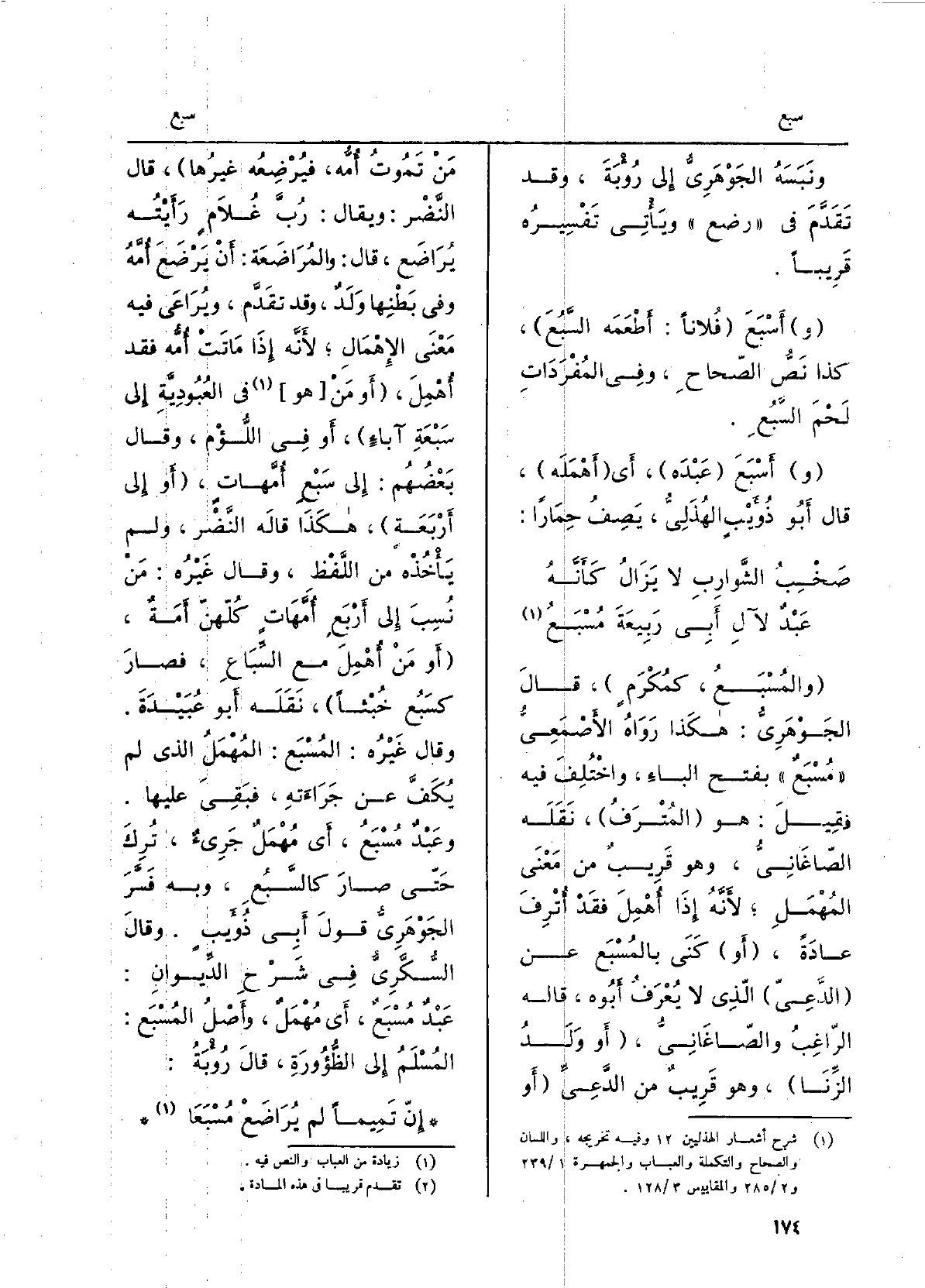 قَالَ: والمُراضَعة: أَن يَرْضَعَ أمَّه وَفِي بَطْنِها ولَدٌ، وَقد تقدّم، ويُراعى فِيهِ معنى الإهمال لأنّه إِذا ماتَتْ أمُّه فقد أُهمِل، أَو مَن هُوَ فِي العُبودِيَّةِ إِلَى سَبْعَةِ آباءٍ، أَو فِي اللُّؤْمِ، وَقَالَ بَعْضُهم: إِلَى سَبْعِ أمَّهاتٍ، أَو إِلَى أَرْبَعةٍ، هَكَذَا قَالَه النَّضْر، وَلم يَأْخُذهُ من اللَّفظِ، وَقَالَ غَيْرُه: مَن نُسِبَ إِلَى أَرْبَعِ أمَّهاتٍ كلُّهَنَّ أَمَةٌ، أَو مَن أُهمِلَ مَعَ السِّباع، فصارَ كسَبُع خُبْثاً، نَقله أَبُو عُبَيْدةَ. وَقَالَ غيرُه: المُسْبَع: المُهمَلُ الَّذِي لم يُكَفَّ عَن جَراءَتِه، فبَقِيَ عَلَيْهَا. وعَبدٌ مُسْبَعُ، أَي مُهمَلٌ جَريءٌ، تُرِكَ حَتَّى صارَ كالسَّبُع، وَبِه فَسَّرَ الجَوْهَرِيّ قولَ أبي ذُؤَيْبٍ. وَقَالَ السُّكَّريُّ فِي شَرْحِ الدِّيوان: عَبدٌ مُسْبَعٌ، أَي مُهمَلٌ، وأصلُ المُسْبَع: المُسلَمُ إِلَى الظُّؤورَة، قَالَ رُؤْبَة: إنَّ تَميماً لم يُراضَعْ مُسْبَعا
