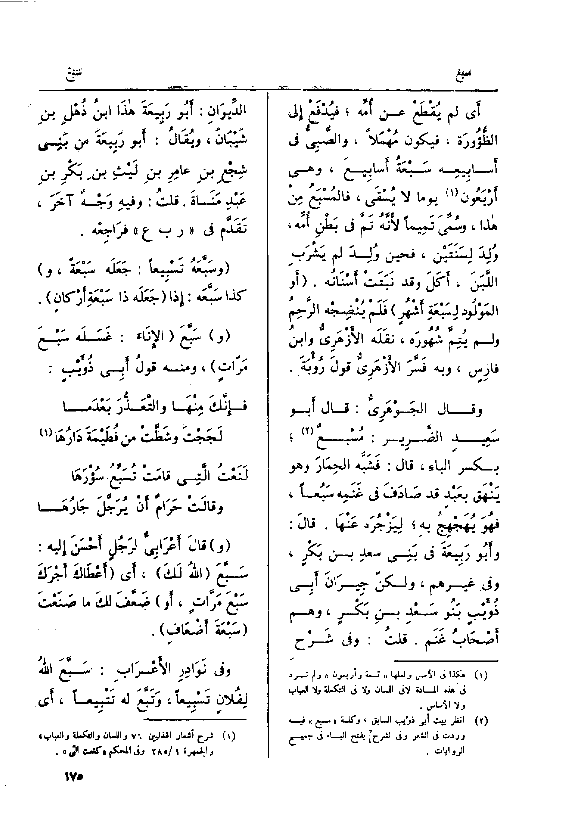 أَي لم يُقطَعْ عَن أمِّه فيُدفَعْ إِلَى الظُّؤورَةِ، فَيكون مُهمَلاً، والصبيُّ فِي أسابيعِه سَبْعَةُ أسابيع، وَهِي أَرْبَعون يَوْمًا لَا يُسقَى، فالمُسْبَعُ مِن هَذَا، وسُمِّي تَميماً لأنّه تَمَّ فِي بَطْنِ أمِّه، وُلِدَ لسَنتَيْن، فحينَ وُلِدَ لم يَشْرَبْ اللبَنَ، أَكَلَ وَقد نَبَتَتْ أَسْنَانُه. أَو المَولودُ لسَبعَةِ أَشْهُرٍ فَلم يُنضِجْه الرَّحِمُ وَلم يُتِمَّ شُهورَه، نَقله الأَزْهَرِيّ وابنُ فارِسٍ، وَبِه فسَّرَ الأَزْهَرِيّ قَوْلَ رُؤْبَةَ. وَقَالَ الجَوْهَرِيّ: قَالَ أَبُو سعيدٍ الضَّرير: مُسْبعٌ بكسرِ الْبَاء، قَالَ: فشَبَّهَ الحِمارَ وَهُوَ يَنْهَقُ بعَبْدٍ قد صادَفَ فِي غنَمِهِ سَبُعاً، فَهُوَ يُهَجْهِجُ بِهِ ليَزْجُرَه عَنْهَا. قَالَ: وَأَبُو رَبيعةَ فِي بني سَعْدِ بنِ بكرٍ، وَفِي غيرِهم، ولكنّ جيرانَ أبي ذُؤَيْبٍ بَنو سَعْدِ بنِ بكرٍ، وهم أَصْحَابُ غَنَم. قلتُ: وَفِي شَرْحِ الدِّيوان: أَبُو رَبيعةَ هَذَا ابنُ ذُهْلِ بنِ شَيْبَان، وَيُقَال: أَبُو رَبيعةَ من بَني شِجْعِ بنِ عامرِ بنِ لَيْثِ بنِ بَكْرِ بنِ عَبْدِ مَناةَ. قلتُ: وَفِيه وَجْهٌ آخَرَ، تقدَّمَ فِي ربع فراجِعْه. وسَبَّعَه تَسْبِيعاً: جَعَلَه سَبْعَةً، وَكَذَا سَبَّعَه: إِذا جَعَلَه ذَا سَبْعَةِ أَرْكَانٍ. سَبَّعَ الإناءَ: غَسَلَه سَبْعَ مَرّاتٍ، وَمِنْه قولُ أبي ذُؤَيْبٍ: