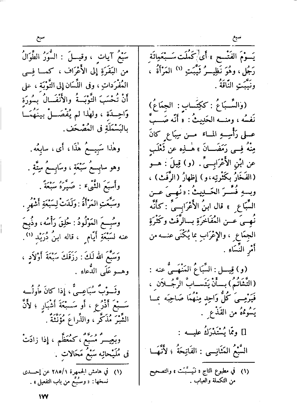 قيلَ: هُوَ الفخَارُ بكَثرَتِه، وإظْهارُ الرَّفَثِ، وَبِه فُسِّرَ الحَدِيث: نُهِيَ عَن السِّباعِ قَالَ ابنُ الأَعرابيِّ: كأَنَّه نُهِيَ عَن المُفاخَرَةِ بالرَّفَثِ وكَثرَة الجِماعِ، والإعرابِ بِمَا يُكْنَى عَنهُ من أَمْرِ النِّساءِ. قيل: السِّباعُ المَنهيُّ عَنهُ: التَّشاتُمُ بأَن يَتسابَّ الرَّجُلانِ، فيَرْمِيَ كلُّ واحِدٍ مِنْهُمَا صاحِبَه بِمَا يسوءُهُ من القَذْعِ. وَمِمَّا يستدرَكُ عَلَيْهِ: السَّبْعُ المَثاني: الفاتِحَةُ، لأَنَّها سَبْعُ آياتٍ، وَقيل: السُّوَرُ الطِّوالُ من الْبَقَرَة إِلَى الأَعرافِ، كَمَا فِي المُفرَداتِ، وَفِي اللِّسَان إِلَى التَّوبَةِ، على أَن تُحسَبَ التَّوْبَةُ والأَنفالُ بسورَةٍ واحِدَةٍ، وَلِهَذَا لم يُفصَل بينَهما بالبَسْمَلَةِ فِي المُصْحَف. وَهَذَا سَبيعُ هَذَا، أَي سابِعُه. وَهُوَ سابِعُ سَبْعَةٍ، وسابِعُ سِتَّةٍ. وأَسْبَعَ الشيءَ: صيَّرَهُ سَبْعَةً. وسَبَّعَتِ المَرأَةُ: ولَدَتْ لِسَبْعَةِ أَشْهُرٍ. وسُبِعَ المَولودُ: حُلِقَ رأْسُه، وذُبِحَ عَنهُ لسَبْعَة أَيّامٍ، قَالَه ابْن دُرَيدٍ. وسَبَّعَ اللهُ لكَ: رَزَقَكَ سَبعةَ أَولادٍ، وَهُوَ على الدُّعاءِ. وثَوبٌ سُباعِيٌّ، إِذا كانَ طولُه سَبعَ أَذْرُعٍ، أَو سبعَةَ أَشْبارٍ، لأَنَّ الشِّبْرَ مُذَكَّر، والذِّراعَ مُؤَنَّثةٌ. وبَعيرٌ مُسَبَّعٌ، كمُعَظَّمٍ، إِذا زادَت فِي مُلَيْحائِه سَبْعُ مَحالاتٍ.