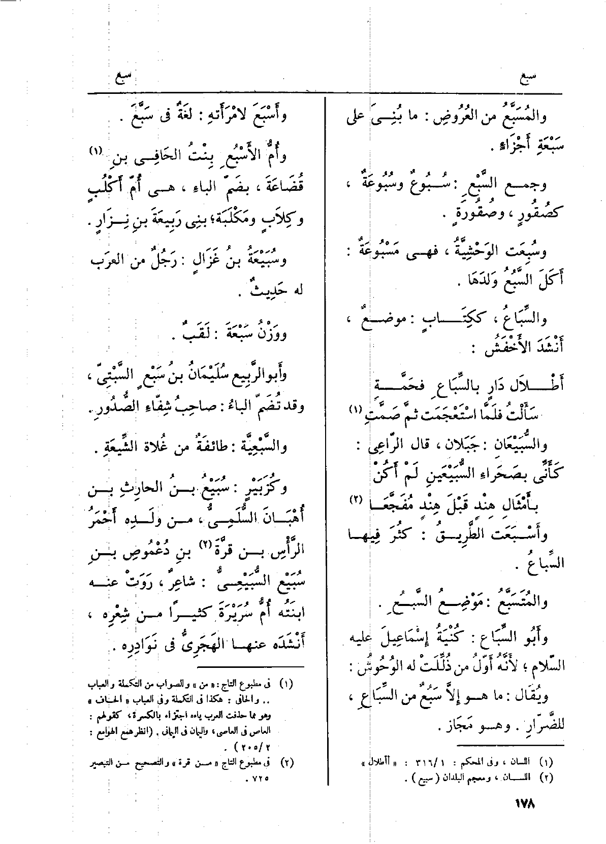 ووَزْنُ سَبْعَةَ: لَقَبٌ. وأَبو الرَّبيعِ سُليمانُ بنُ سَبعٍ السَّبْتِيّ، وَقد تُضَمُّ الباءُ: صاحِبُ شِفاءِ الصُّدور. والسَّبْعِيَّةُ: طائفَةٌ من غلاةِ الشِّيعَة. وكُزُبَيْرٍ: سُبَيْعُ بنُ الحارِثِ بنِ أُهْبانَ السُّلَمِيُّ، من ولَده أَحمرُ الرَّأْسِ بن قرَّةَ بنِ دُعموصِ بن سُبَيع السُّبَيْعِيُّ: شاعرٌ، روَت عَنهُ ابنَتُه أُمُّ سُرَيْرَةَ كثيرا من شعرِه، أَنشدَه عَنْهَا الهَجَرِيُّ فِي نوادرِه.