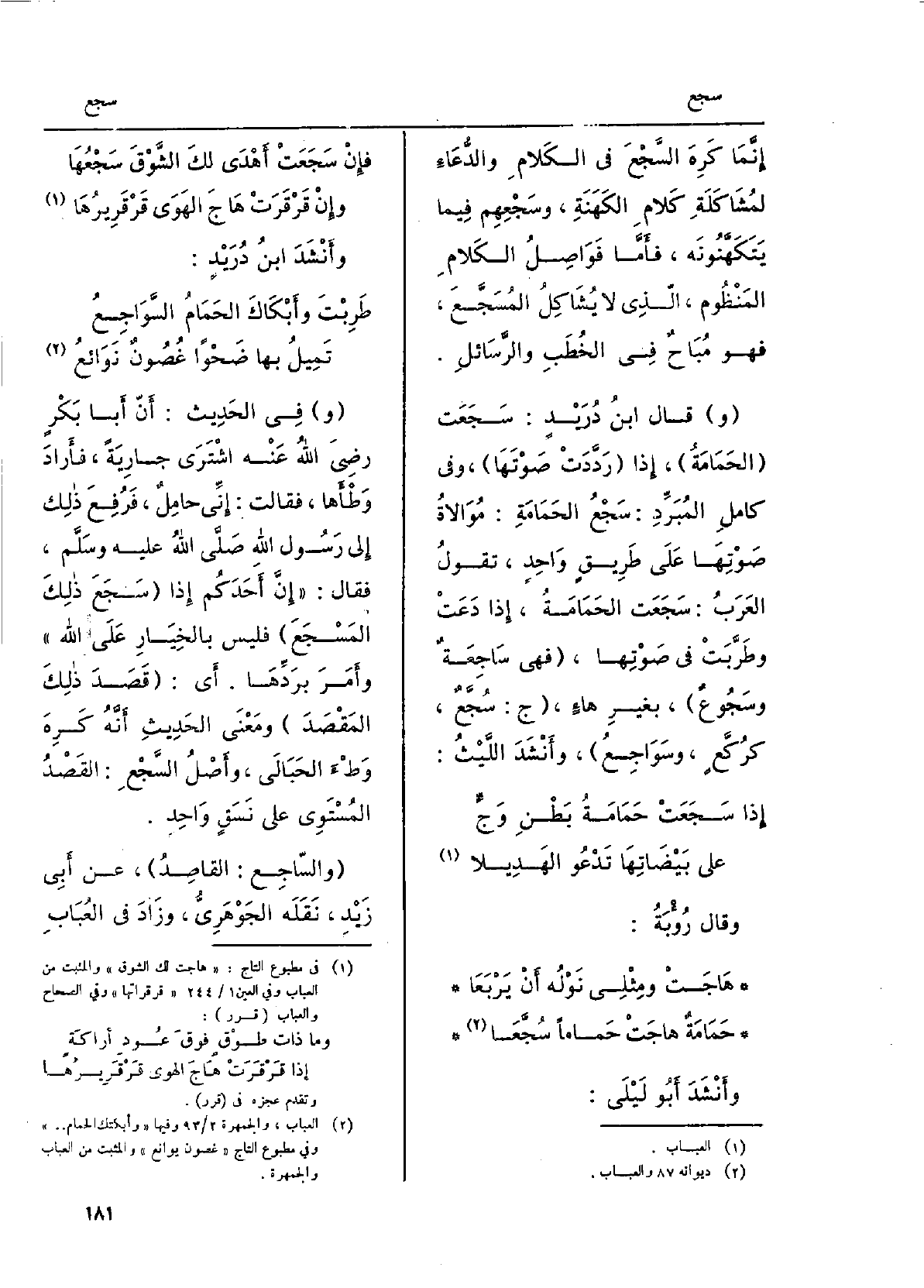 كَرِهَ السَّجْعَ فِي الْكَلَام والدُّعاءِ لِمُشاكَلَةِ كَلَام الكَهَنَةِ، وسَجْعِهم فِيمَا يَتَكَهَّنونَه، فأَمّا فواصِلُ الكلامِ المَنظوم، الّذي لَا يُشاكِلُ المُسَجَّعَ، فَهُوَ مُباحٌ فِي الخُطَبِ والرَّسائلِ. قَالَ ابْن دُريدٍ: سَجَعت الحَمامَةُ، إِذا رَدَّدَت صوتَها، وَفِي كَامِل المُبَرِّد: سَجْعُ)