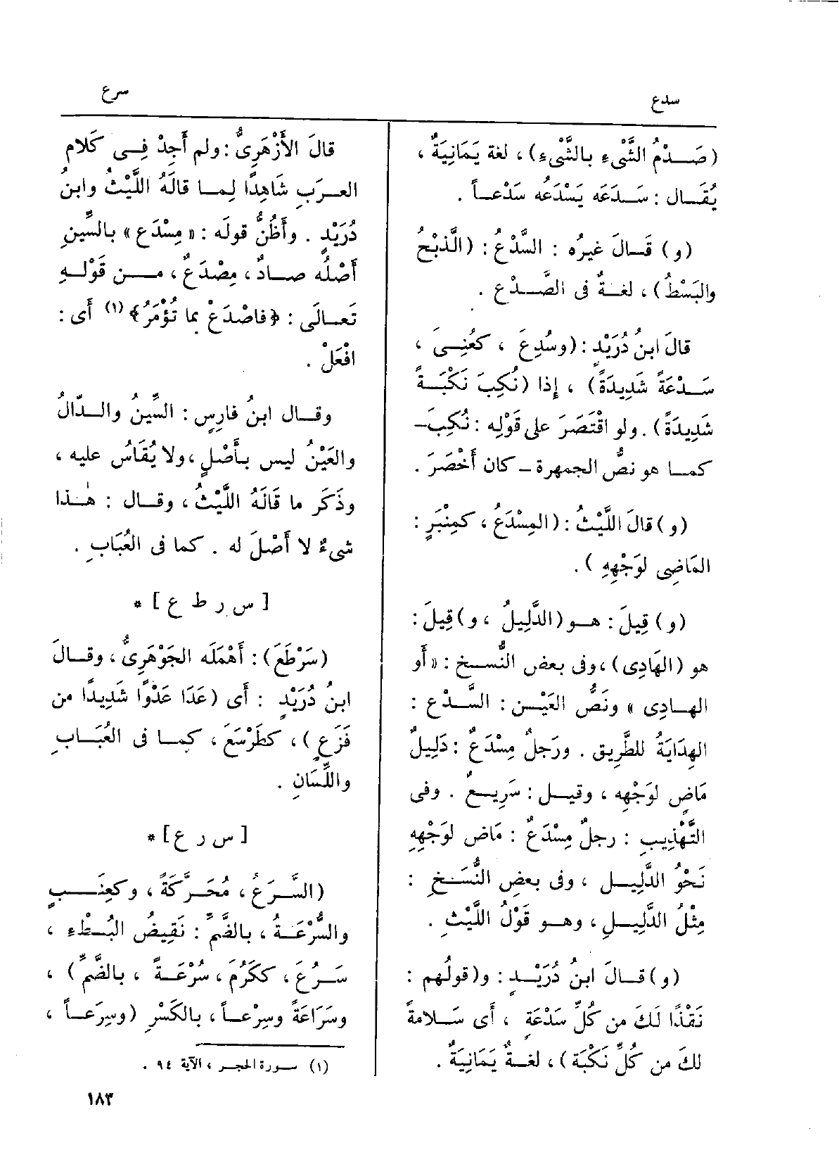 صَدْمُ الشيءِ بالشَّيءِ، لغةٌ يَمانِيَةٌ، يُقالُ: سَدَعَه يَسْدَعُه سَدْعاً. قَالَ غيرُه: السَّدْعُ: الذَّبْحُ والبَسْطُ، لُغَة فِي الصَّدْع. قَالَ ابْن دُريدٍ: وسُدِعَ، كعُنِيَ، سَدْعَةً شديدَةً، إِذا نُكِبَ نَكْبَةً شديدَةً. وَلَو اقتصَرَ على قولِه: نُكِبَ، كَمَا هُوَ نصُّ الجَمْهَرَة، كانَ أَخْصَرَ. قَالَ الليثُ: المِسْدَعُ، كمِنْبِرٍ: الْمَاضِي لوَجهِه. قيلَ: هُوَ الدَّليلُ، وَقيل: هُوَ الْهَادِي، وَفِي بعض النُّسَخ: أَو الْهَادِي، ونَصُّ الْعين: السَّدْع: الهِدايَةُ للطَّريق. ورجلٌ مِسْدَعٌ: دَليلٌ ماضٍ لوَجههِ، وَقيل: سَريعٌ. وَفِي التَّهذيب: رَجلٌ مِسْدَعٌ: ماضٍ لِوَجهِهِ نَحْوُ الدَّليل، وَفِي بعض النُّسَخِ: مِثلُ الدَّليلِ، وَهُوَ قَول الليثِ. قَالَ ابنُ دُرَيدٍ: وقولُهُم: نَقْذاً لَكَ من كُلِّ سَدْعَةٍ، أَي سلامَةً لكَ من كلِّ نَكْبَةٍ، لغةٌ يَمانيَةٌ. قَالَ الأَزْهَرِيّ: وَلم أَجِدْ فِي كَلَام العَرَبِ شاهِداً لِما قالَه الليثُ وابنُ دُرَيدٍ. وأَظُنُّ قولَهُ: مِسْدَع، بالسِّين أَصلُه صادٌ، مِصْدَعٌ، من قولِه تَعَالَى: فاصْدَعْ بِما تُؤْمَرْ أَي افْعَلْ. وَقَالَ ابنُ فارِسٍ: السِّينُ والدَّالُ والعَيْنُ ليسَ بأَصلٍ، وَلَا يُقاسُ عَلَيْهِ، وذَكَر مَا قالَه الليثُ، وَقَالَ: هَذَا شيءٌ لَا أَصلَ لَهُ. كَمَا فِي العُبابِ.