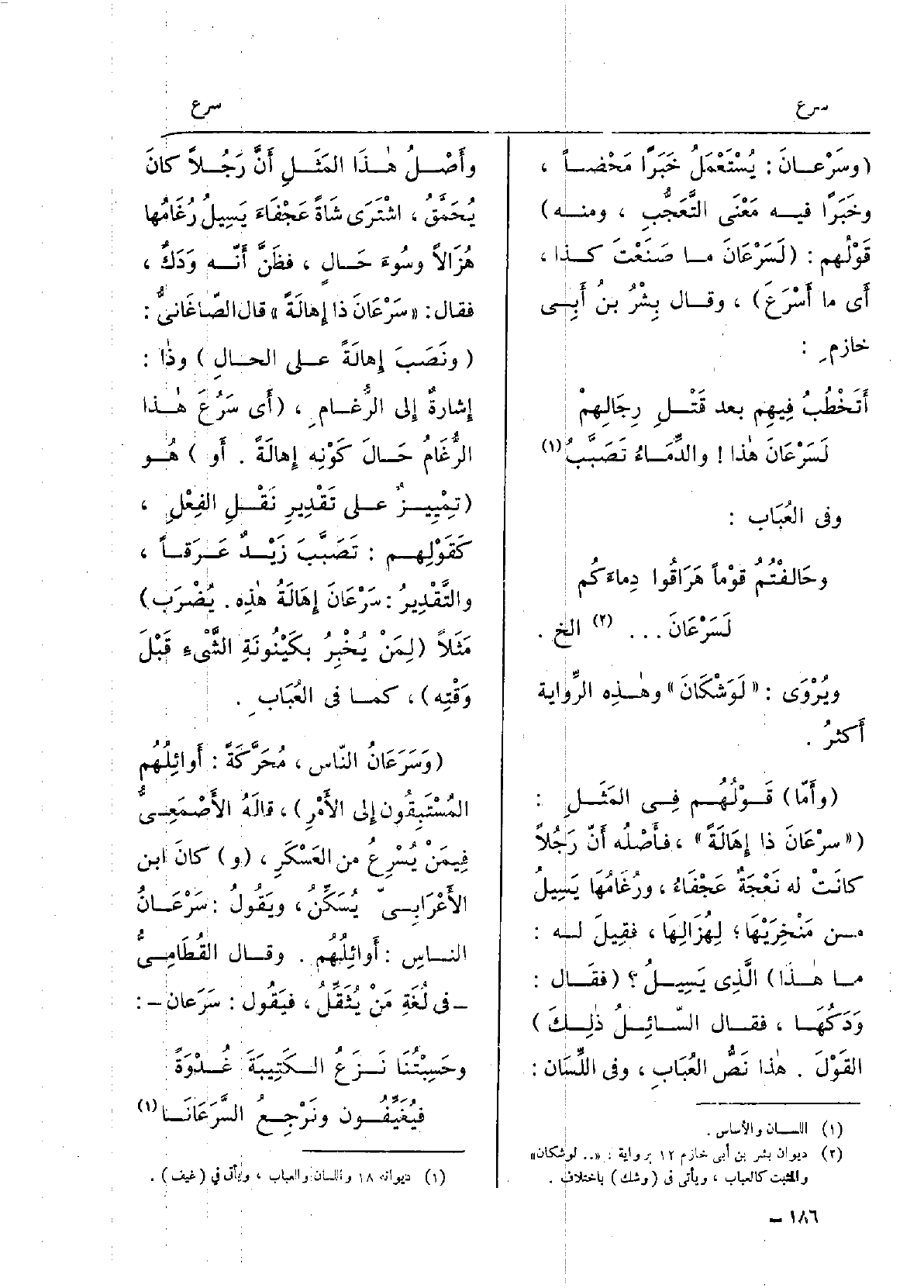 وسَرْعانَ: يُستعمَلُ خَبراً مَحْضاً، وخَبراً فِيهِ معنى التَّعَجُّبِ، وَمِنْه قولُهم: لَسَرْعانَ مَا صَنَعْتَ كَذَا، أَي مَا أَسْرَعَ، وَقَالَ بِشْرُ بنُ أَبي خازِمٍ: